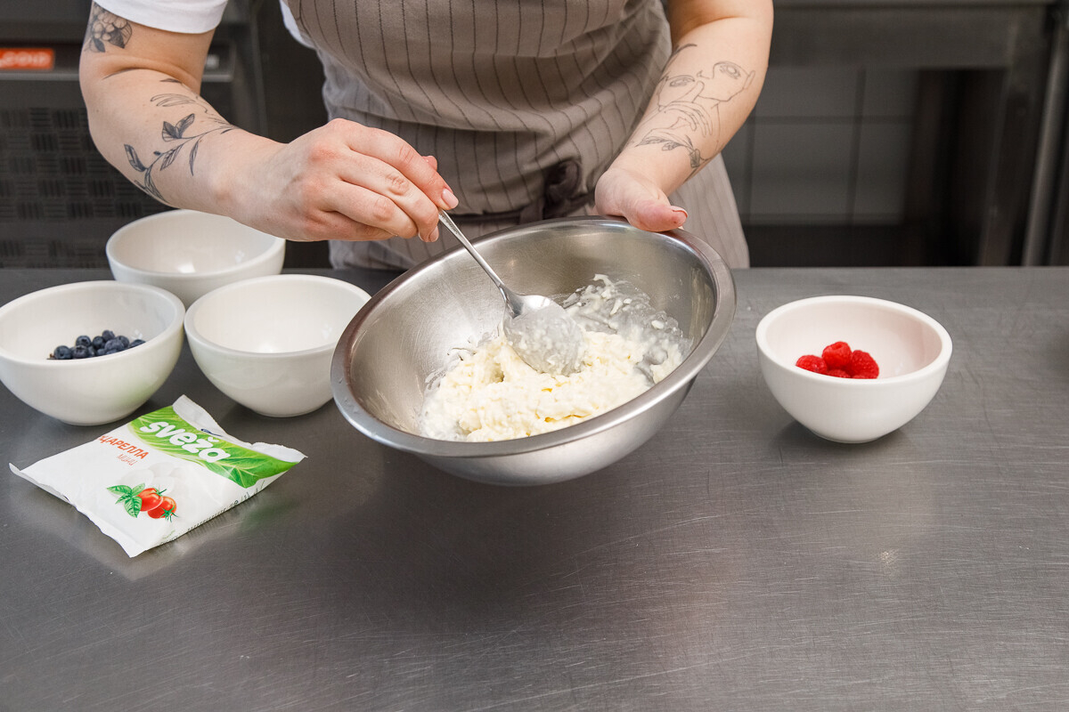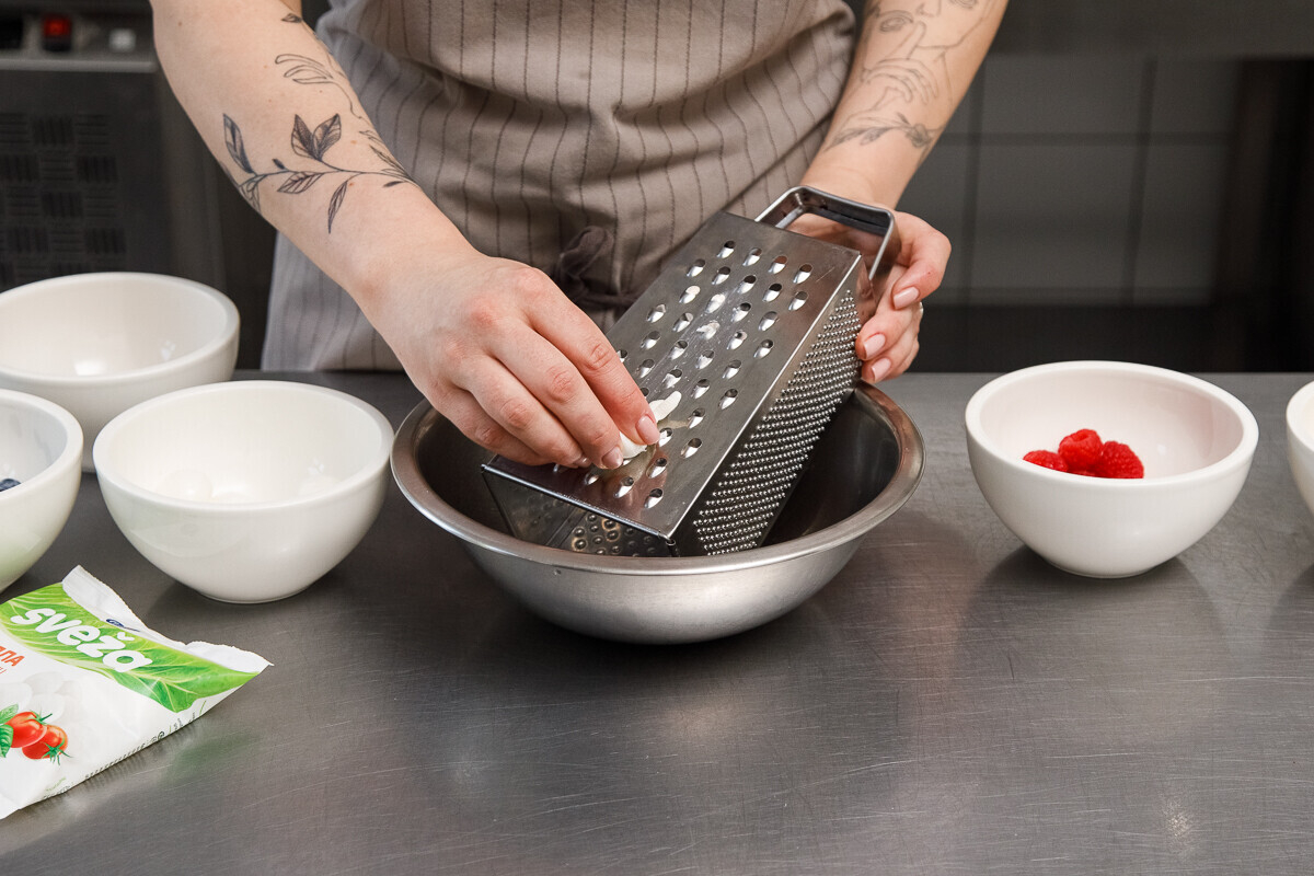 1. Натираем моцареллу на крупную терку. В этом случае лучше использовать крупный шарик, он также есть в линейке Sveza. Этот момент важен, потому что если натереть на мелкую, то вкус сыра смешается с кремом и даже «потеряется». А вот соленые волокна, которые будут ярко звучать на фоне сладкого крема — то, что нужно. Консистенция получится пастообразная, но неоднородная.