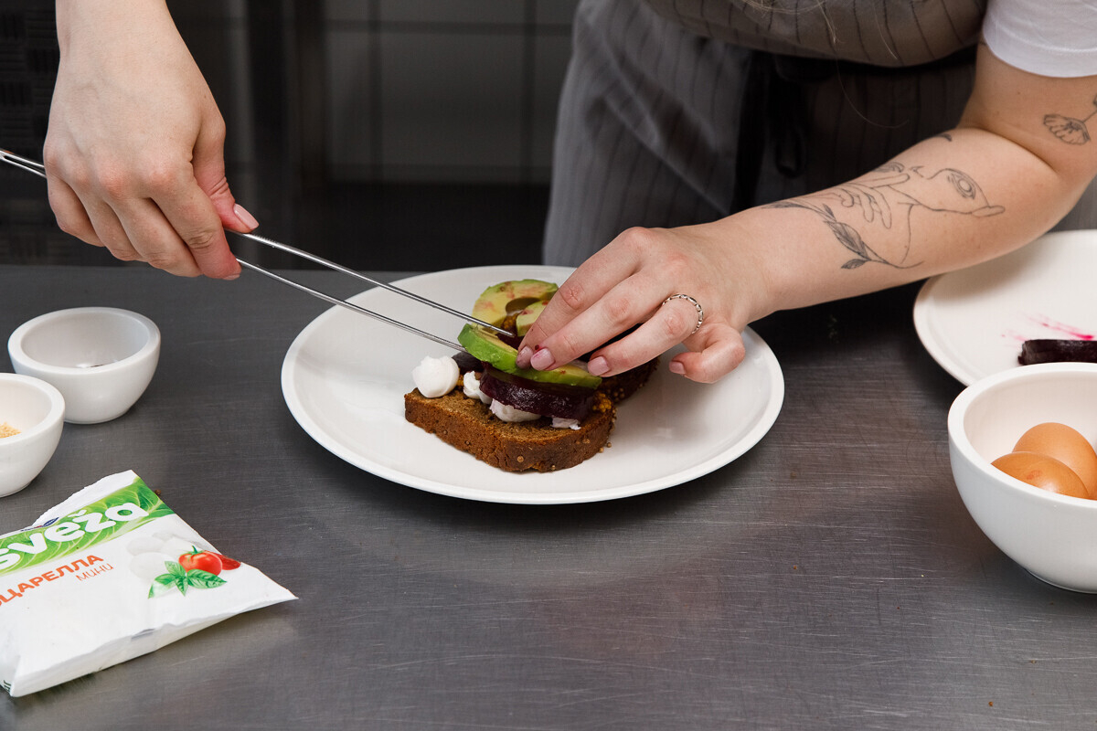 2. Печеную свеклу и авокадо нарезаем произвольно, после чего ломтиками выкладываем на моцареллу. Завершаем яйцом пашот, которое отвариваем удобным вам способом. Если нужна подсказка, можете почитать этот текст.