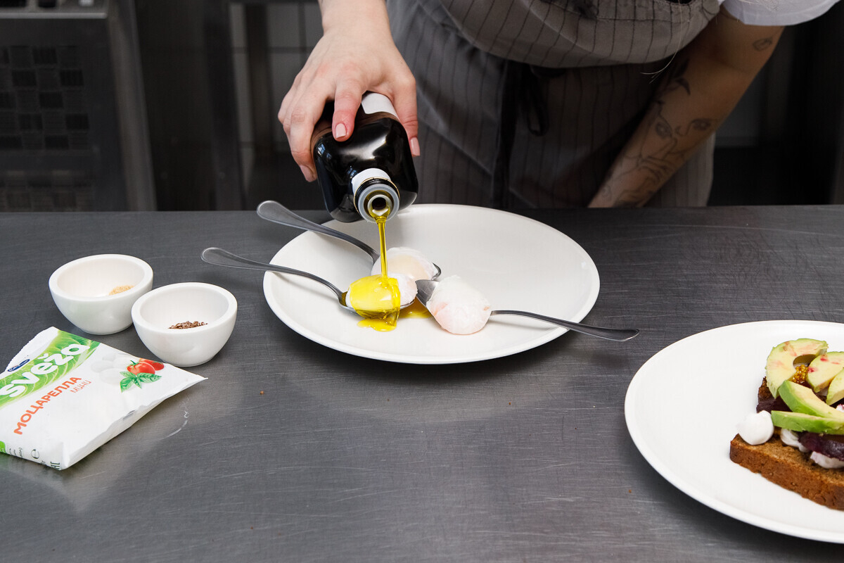3. Готовые яйца перед выкладкой на тост поливаем оливковым маслом, посыпаем тертым фундуком и семенами льна. Солим и перчим по вкусу. Идеальный завтрак готов!
