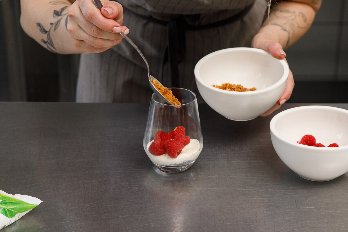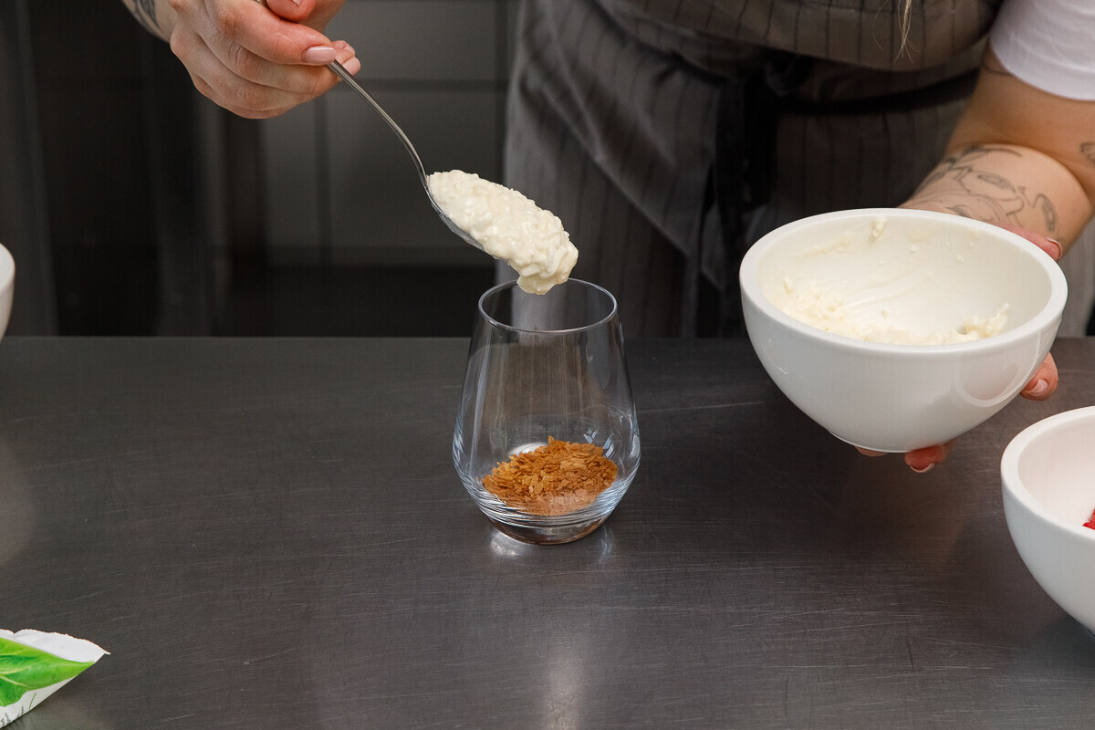 2. Десерт выкладываем слоями в стакан, чередуя сырную основу с вафельной крошкой и сезонными ягодами. Вместо сезонных ягод (или вместе с ними) можно использовать банан.