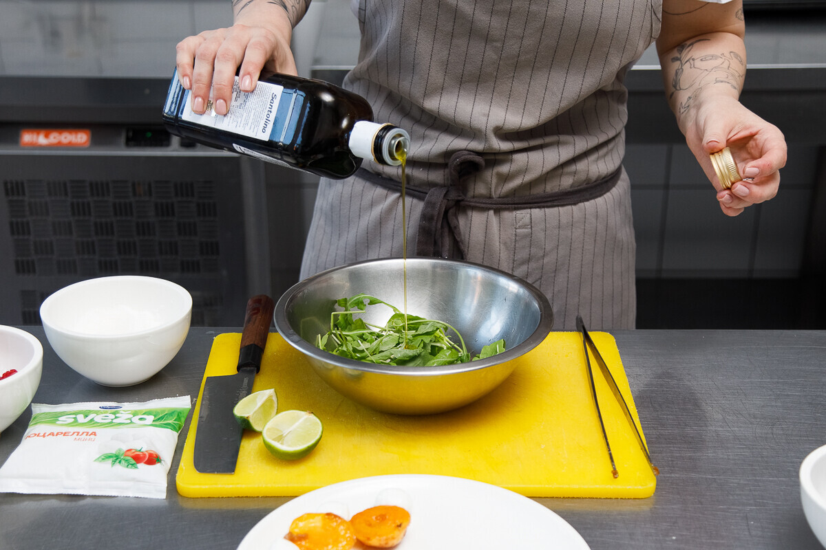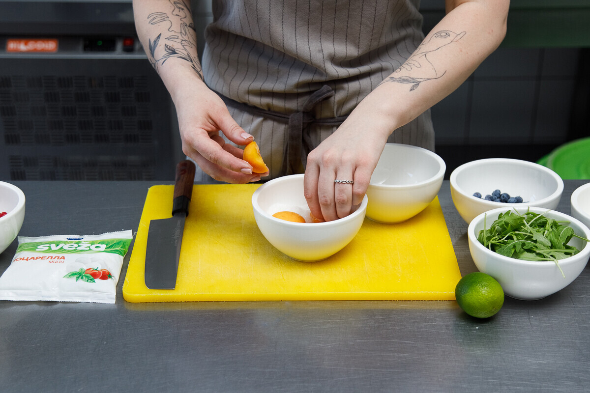 3. Отрываем хвостики от рукколы и заправляем ее соком четвертинки лайма (при желании его можно заменить лимоном) и оливковым маслом по вкусу. Рукколу можно заменить любой другой зеленью по вкусу: корном, шпинатом, салатным миксом. Однако лишь она дает ту самую горчинку, которая круто балансирует с солоноватостью моцареллы и сладостью абрикосов.