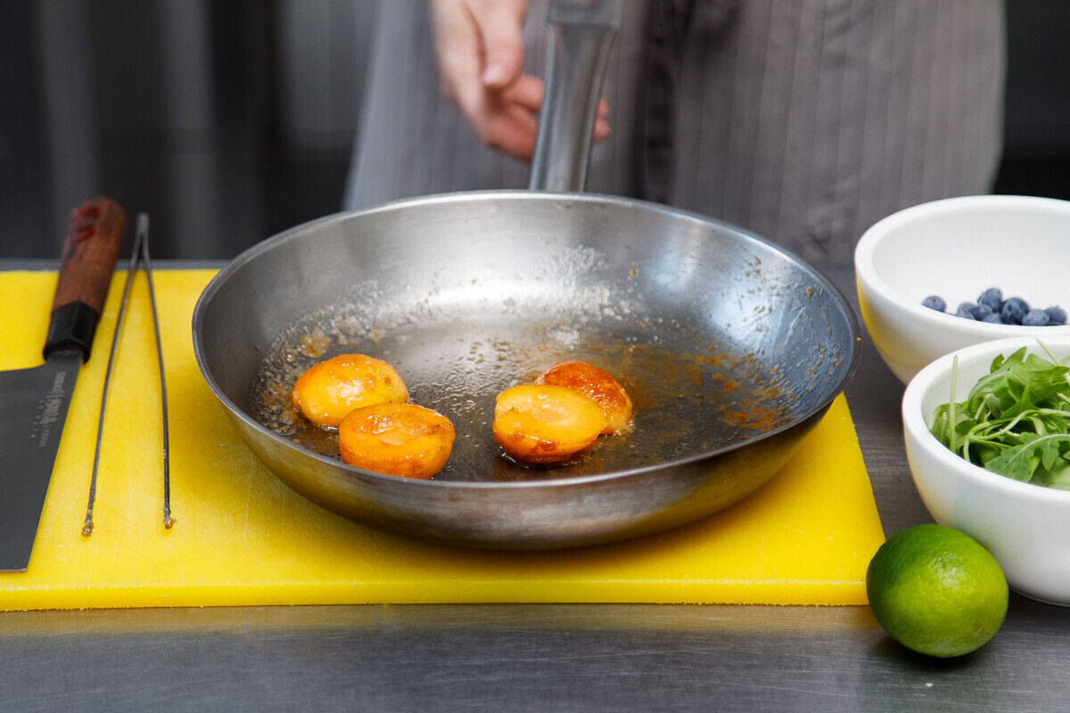 1. Разделяем абрикосы на две половинки, вынимаем косточку. Процесс карамелизации может звучать сложно, но на самом деле элементарен. Анна погружает дольки абрикосов в сахар, чтобы он обволакивал фрукт со всех сторон, и отправляет на сковороду при небольшом огне. Как только сахар начинает «гореть», добавляем немного сливочного масла, выдерживаем около минуты и снимаем с огня. Имейте в виду, что такой абрикос можно использовать не только для салатов, но и подавать с мясом, закусками, выкладывать на брускетты.