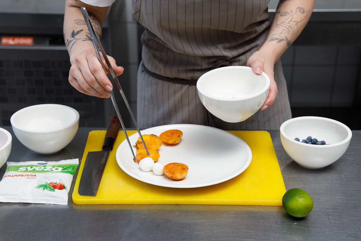 2. Теплые абрикосы отправляем на тарелку, рядом выкладываем моцареллу. Сыр Анна предлагает не рвать на кусочки, а выкладывать шариками — они как раз оптимального размера.