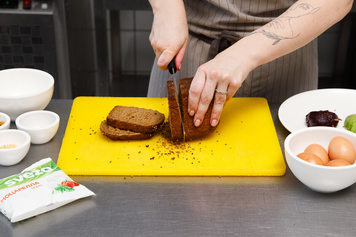 1. Отрезаем ломтик бородинского хлеба, на который первым слоем выкладываем моцареллу: для тоста рвем ее на небольшие кусочки. Бородинский хлеб Анна не подсушивает, но подчеркивает, что это дело вкуса. Добавляем немного зерновой горчицы.
