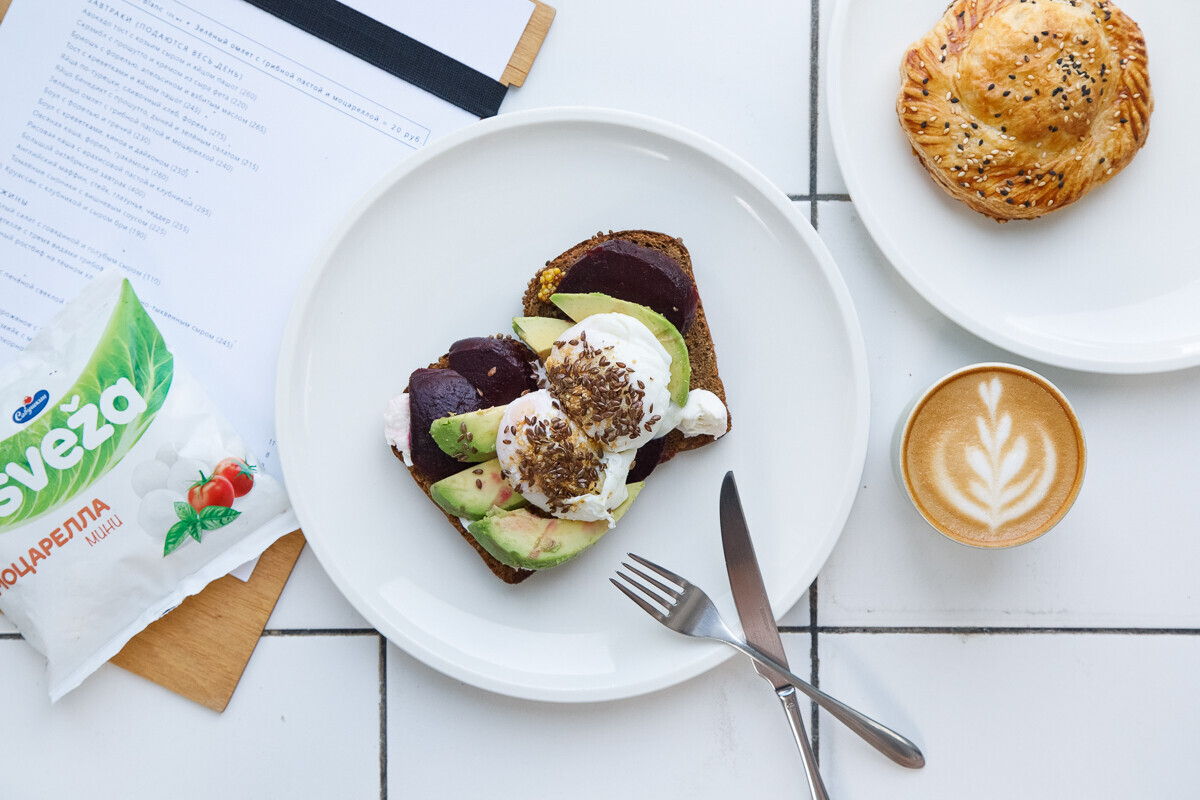 Тост на завтрак с моцареллой, свеклой, авокадо и яйцом пашот