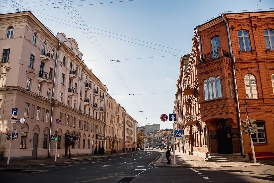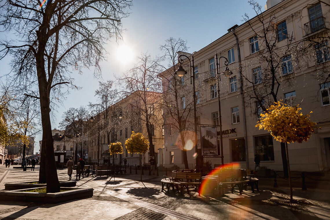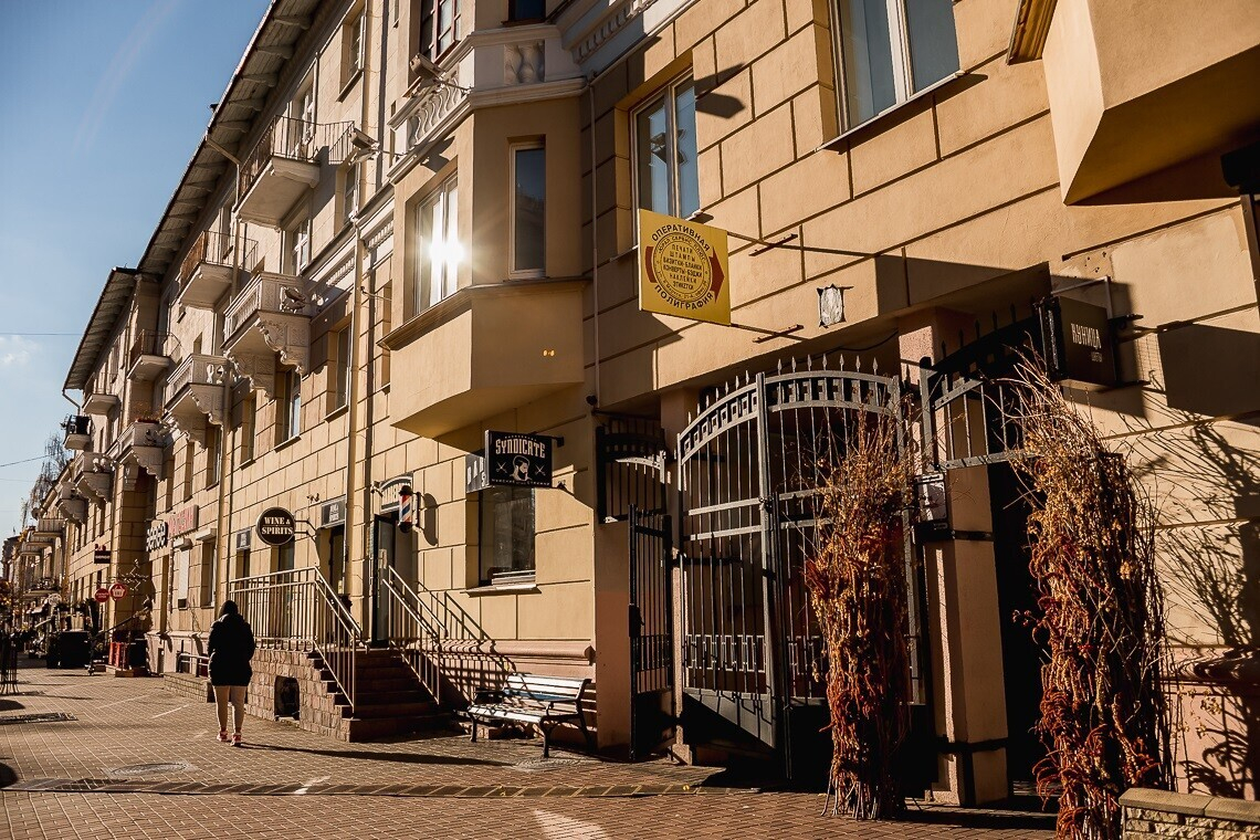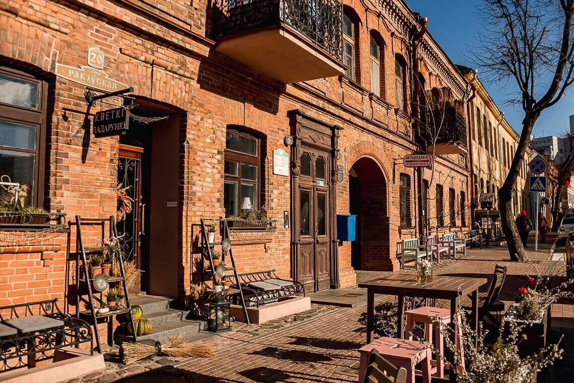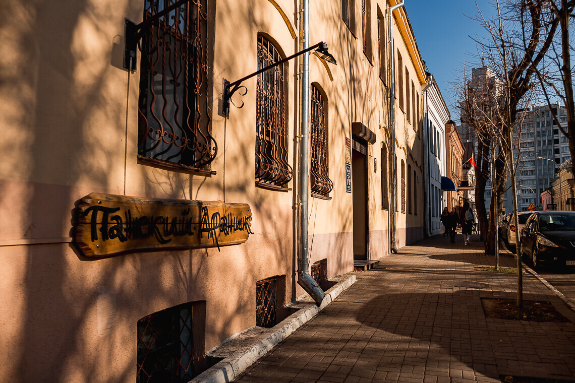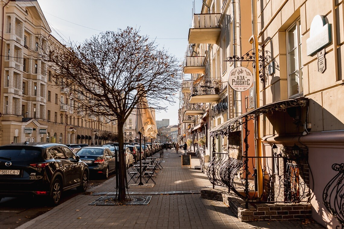 Революционная улица хороша сама собой. Ее можно назвать кусочком Европы в Минске: брусчатка, витрины магазинов, уютные кафе, атмосферные фонари. Здесь стоит отметить «Красный дворик» — место, которое добавит красок в ленту в любую пору года.