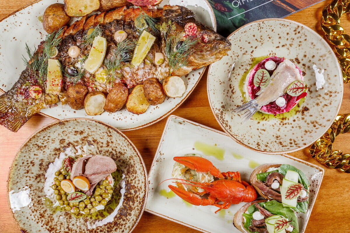 - Карп фаршированный овощами и лососем. Подаётся с картофелем печеным по-домашнему, оливками, маслинами и соусом спайси.
