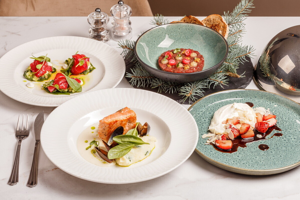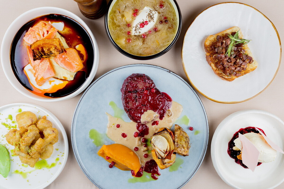 - Тартар из оленя с соусом из печеного яблока, клюквой и трюфельным хлебом;
