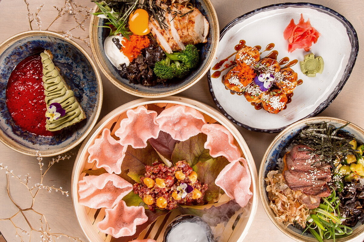 - Крахмальная лапша «фунчоза», вок с соевой спаржей «фучжу», свежей морковью, дайконом, огурцом в соусе из ферментированных чёрных бобов и маринованное филе тунца в пасте кочхуджан;
