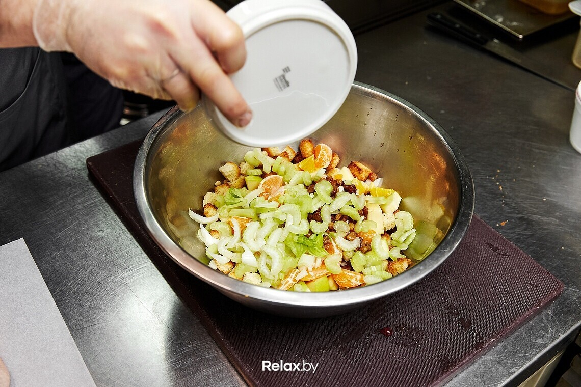 - Все указанные выше ингредиенты (мандарины, апельсины, яблоки, сельдерей, репчатый лук) нарезаем на достаточно крупные кусочки и смешиваем в одной емкости. Добавляем изюм, кедровый орех и предварительно заготовленные хлебные сухарики. Последние нужны для того, чтобы впитать лишний жир. С этой же функцией справится почти любая крупа: например, перловка или рис.