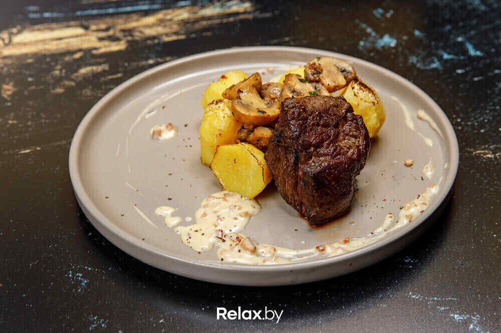 Стейк Стриплойн с картофелем по-деревенски 45 руб.;