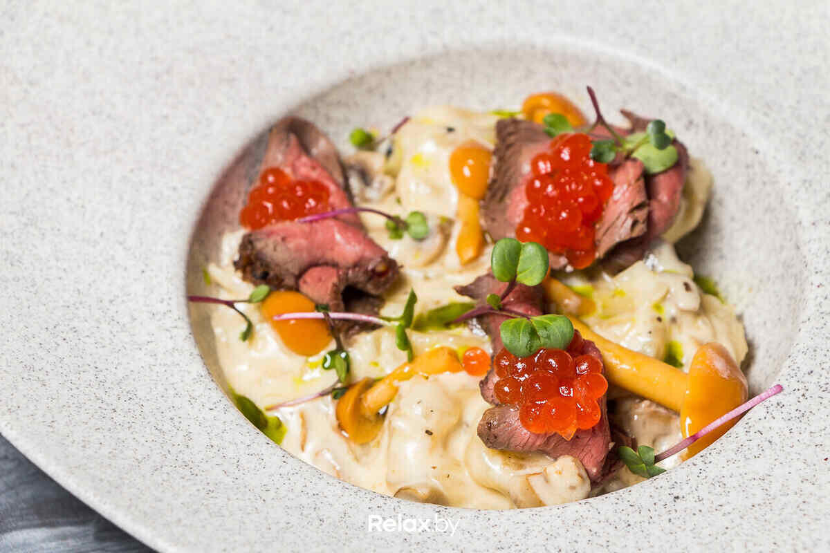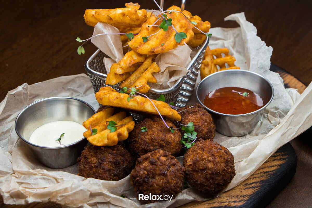 Меню получилось абсолютно космополитичным. Здесь микс популярных позиций из итальянской, немецкой, мексиканской, белорусской, русской и других кухонь. Однако определенный уклон у меню все-таки есть — шеф-повар Сергей Крисенков делает ставку на мясные блюда. Обыграли в меню и пивной формат заведения, поэтому напиток есть в рецептуре многих позиций: например, ирландский пирог с мясом под сырно-пивным соусом, филе миньон с луково-пивным соусом или даже мороженое в пивном кляре.