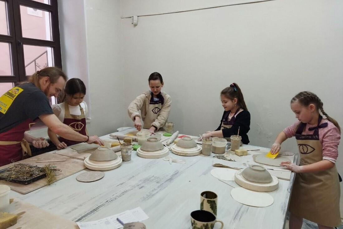 Для детского дня рождения здесь также созданы все условия: можно здорово провести праздник в атмосфере творчества и искусства. Мастер-класс включает в себя лепку одного предмета, например, чашки либо тарелочки. Детки постарше смогут слепить набор для завтрака — чашку с блюдцем. Лепка одного предмета занимает полтора часа, лепка двух — два с половиной. Взрослые могут участвовать вместе с детьми или подождать в кафе на втором этаже.