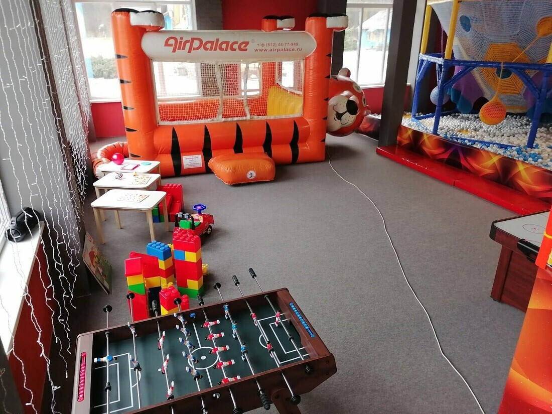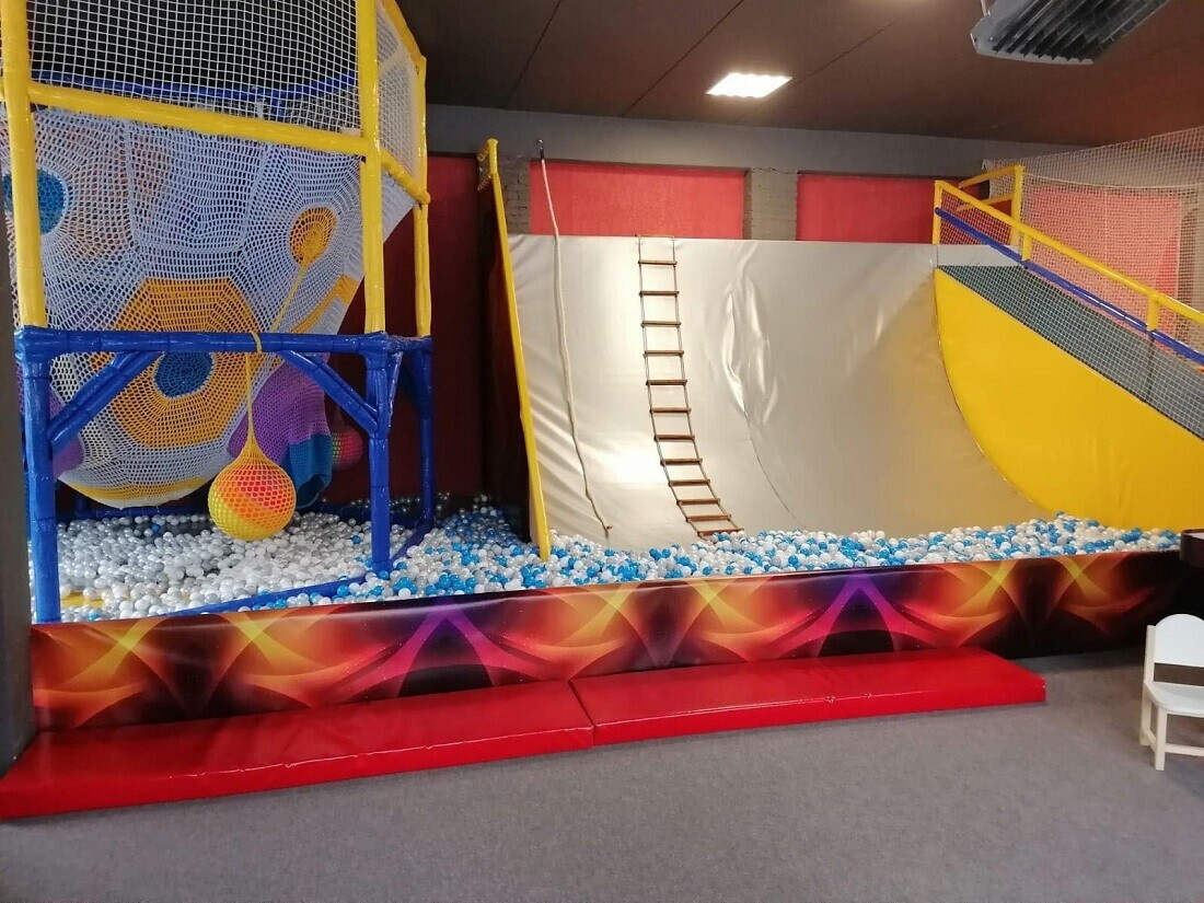 - огромная игровая площадка под крышей, для малышей и подростков с батутами, горками, лабиринтом, шариками, настольными играми;