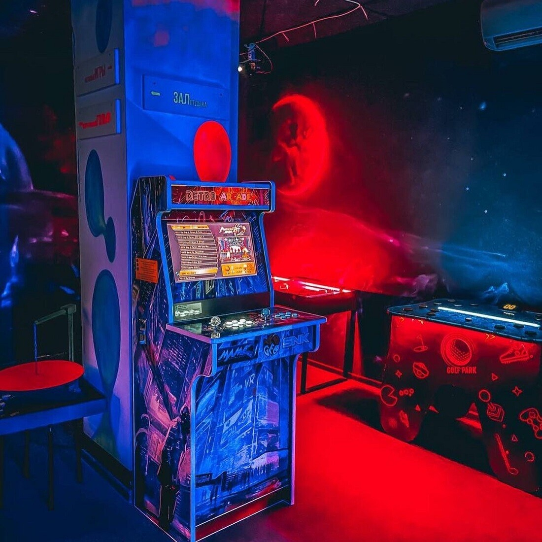 Итак, неоновый мини-гольф — это 12 дорожек, сухой бассейн со светящимися шарами, симулятор большого гольфа, игровые автоматы, игры на баланс и координацию, неоновая фотозона, а также комфортная комната отдыха с игровой приставкой PS4.