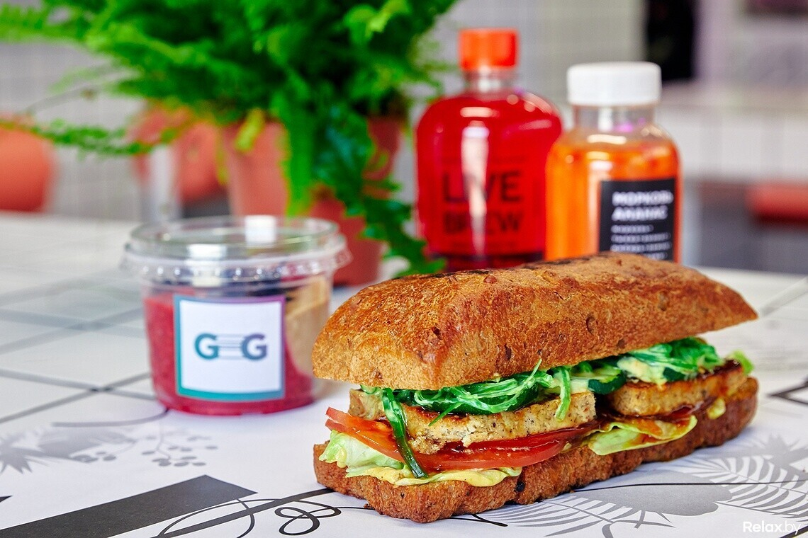 Меню для Green+Go в то время разработал шеф-повар, аюрвед и йог Алексей Король. Можно было заказать сэндвич, суп, салат или киноа боул. Фирменным блюдом стали котлеты из окары с добавлением овощей и нори — водорослей.