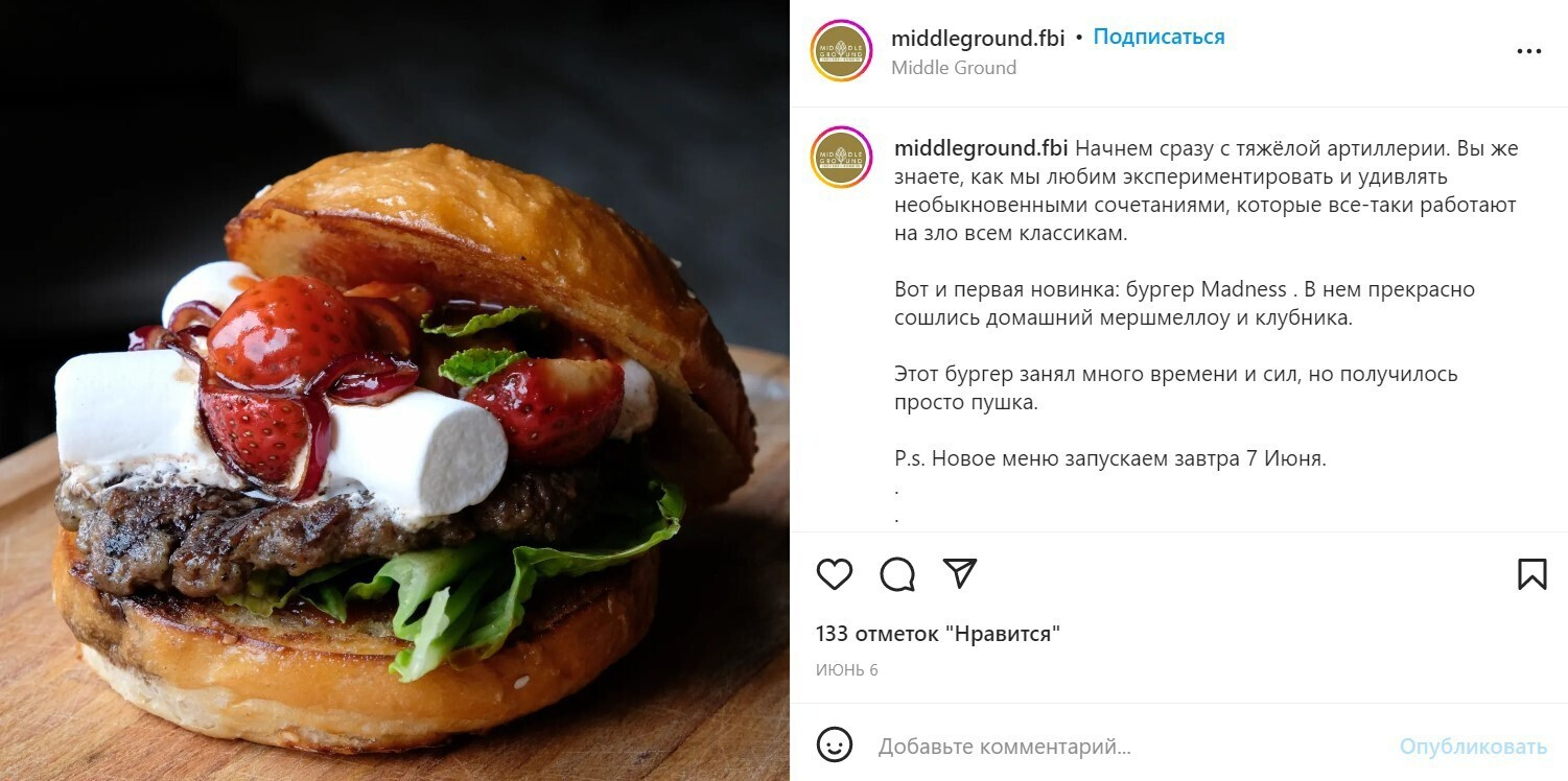 Или яркий пример на нашем рынке — BurgerLab. Мне кажется они никогда не «устанут»! Например, летом запускают гриль и в прямом смысле поджигают интерес гостей (смеется).