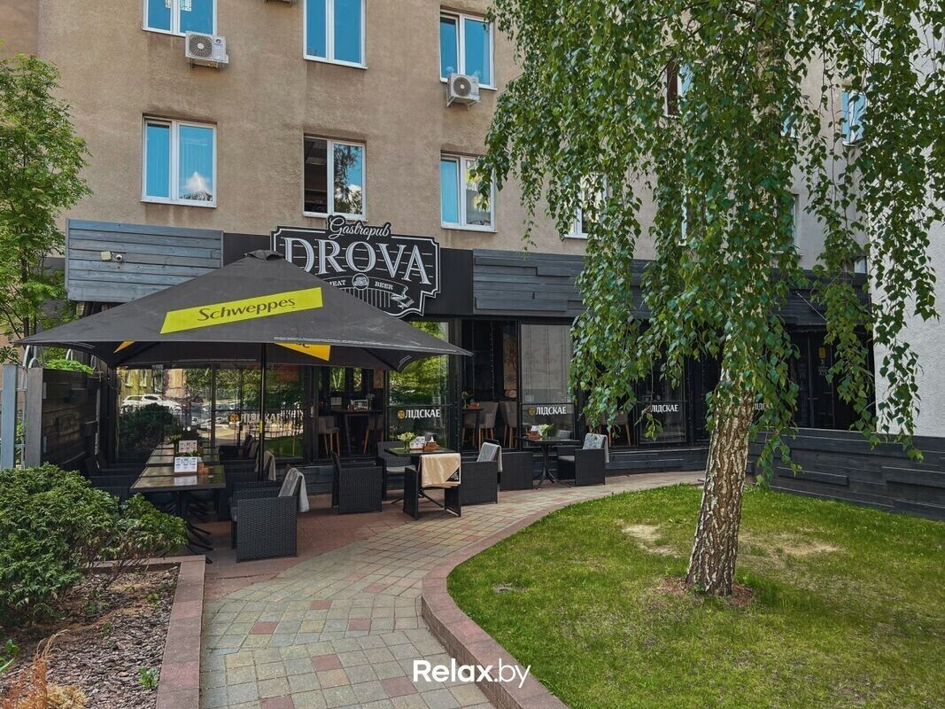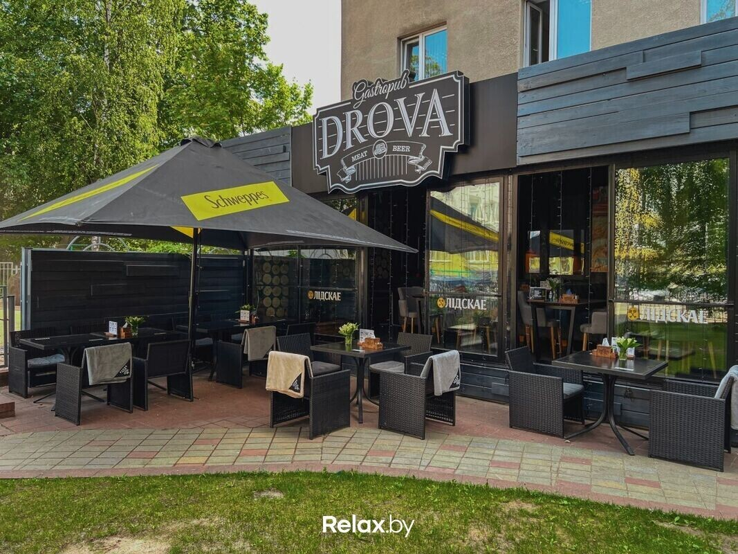 Gastropub DROVA (Гастропаб Дрова) — городское кафе в центре города с современным интерьером. В интерьере здесь стиль loft: кирпичная отделка стен, массивные деревянные столы и дизайнерские светильники с мягким светом. Уюта помещению добавляют картины на стенах и множество зеркал в рамах. А вот террас здесь две: закрытая, в которой будет комфортно и дождливую погоду, и открытая, идеальная для теплых вечеров.