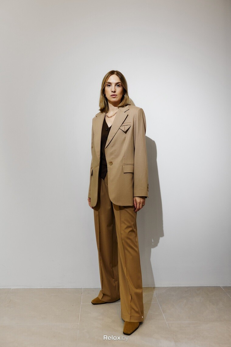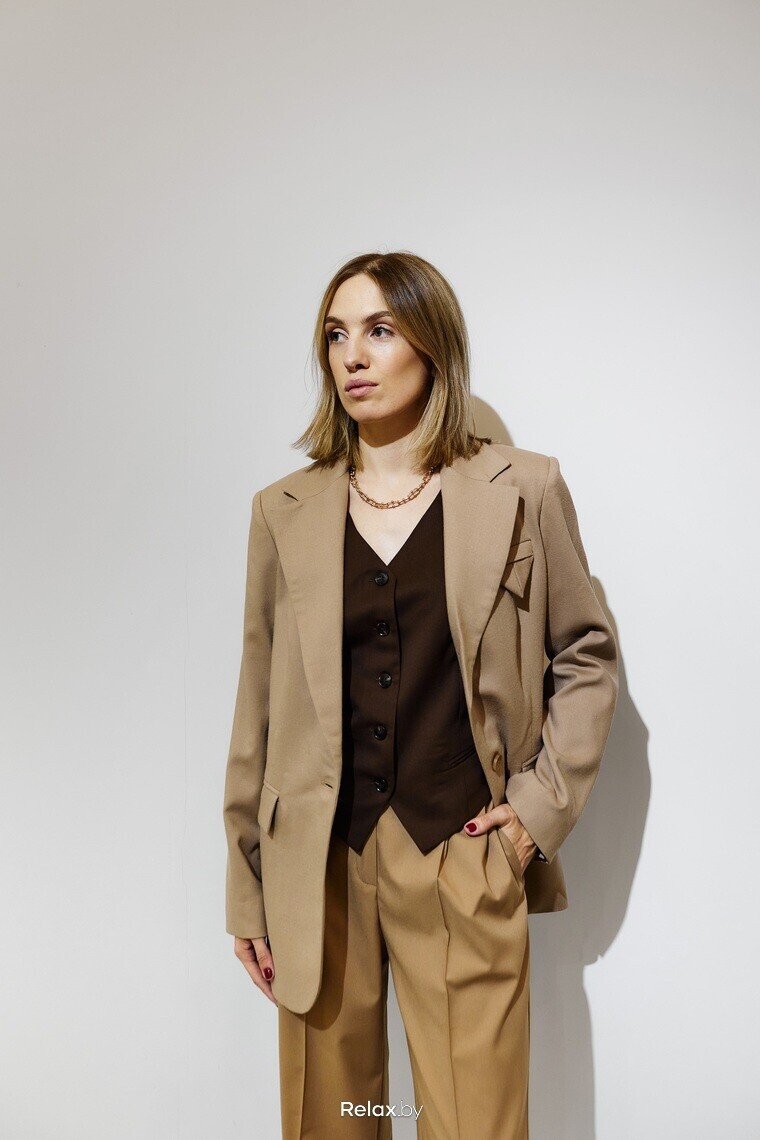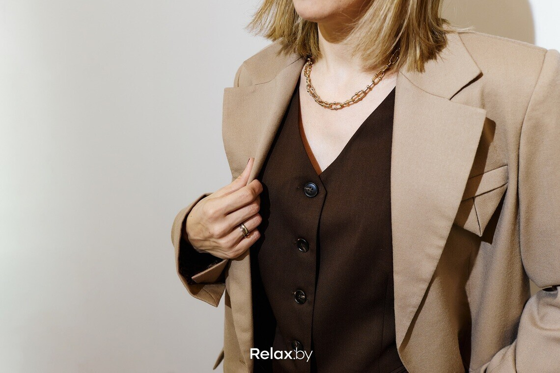— В случае с костюмом крайне важно выбирать актуальную посадку. На мне «мужской» жакет прямого кроя с фиксированной линией плеча, расширенные брюки палаццо и классический прямой жилет. Последний без жакета рекомендую носить с рубашкой, но не с водолазкой.