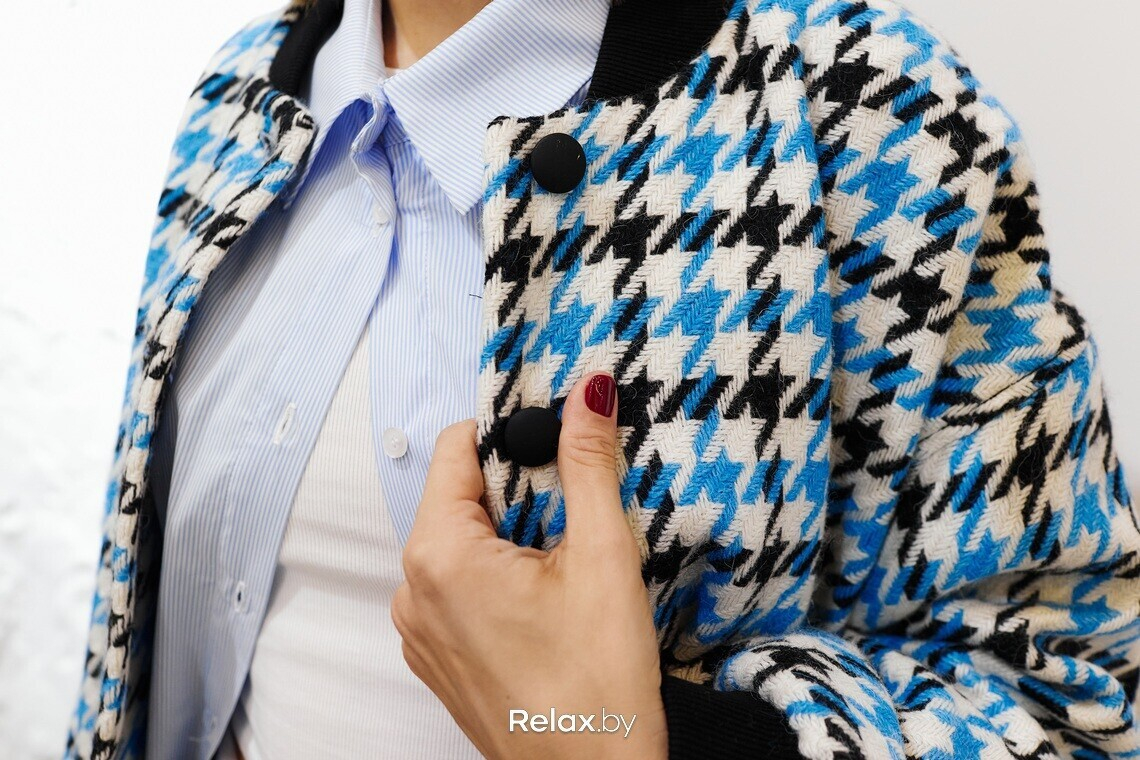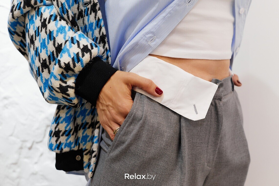 — Бомбер нужно понимать по психологии продления впечатлений. Он создает впечатление «своего парня» или «своей девушки». Очень расслабляет образ, поэтому я решила его чуть «собрать» и стилизовала со строгими брюками и рубашкой. Кстати, возьмите на заметку этот модный прием, который создаст многослойность: рубашку надеваем на топ или футболку и расстегиваем снизу (смотрите на фото ниже). Идеально сочетается бомбер и с женственными вещами: например, юбками мини и высокими сапогами.