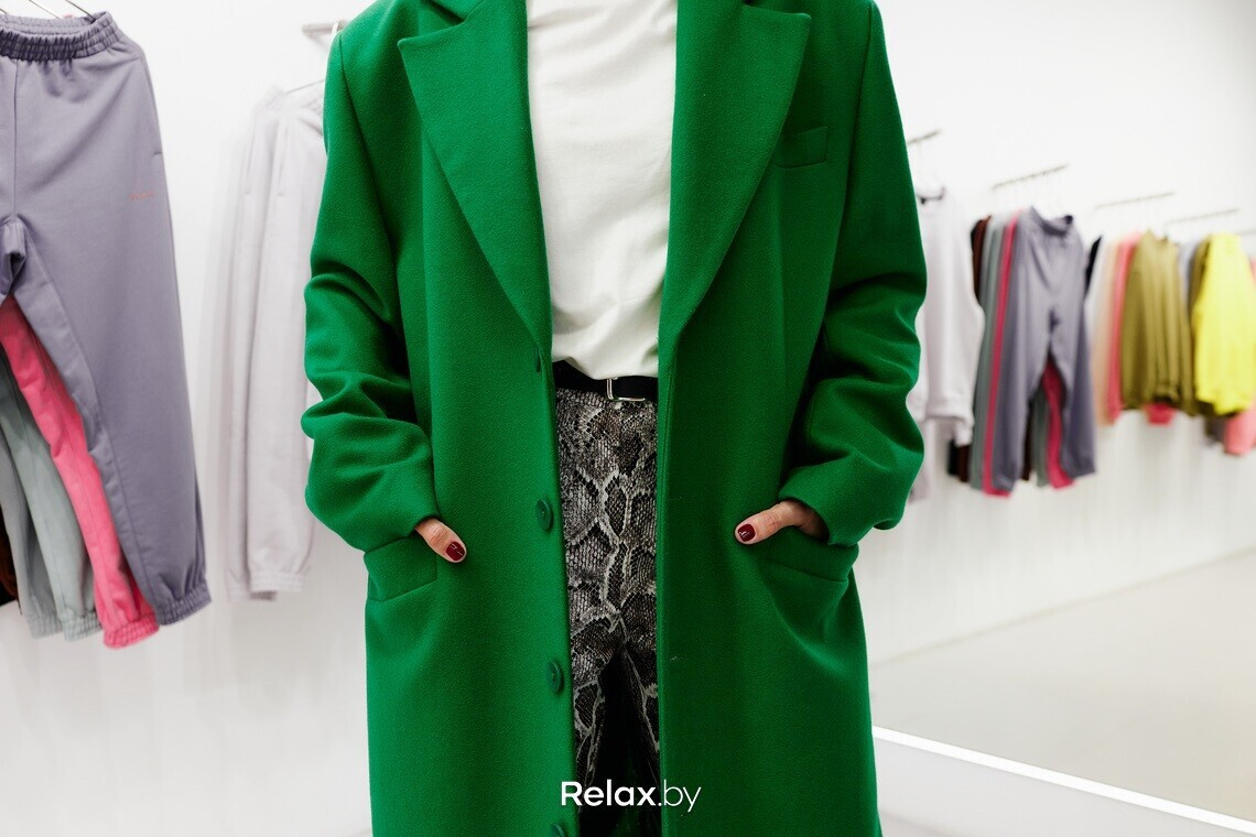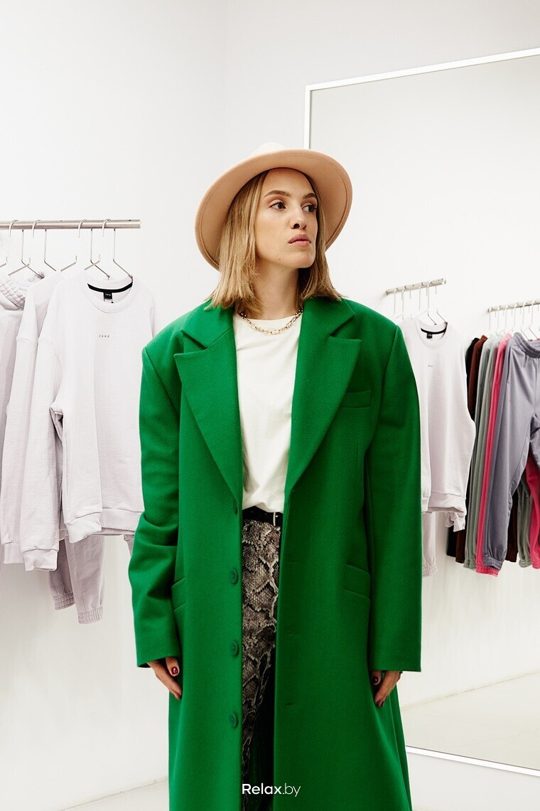 — Вновь мы выбираем объем и намерено увеличенную линию плеча, как у Balenciaga. Сочное зеленое, немного дерзкое и строгое в крое. Я стилизовала это пальто с нежно-розовой шляпой, что довольно смело, но однозначно комплиментарно. Также добавила грубую обувь и брюки со змеиным принтом.