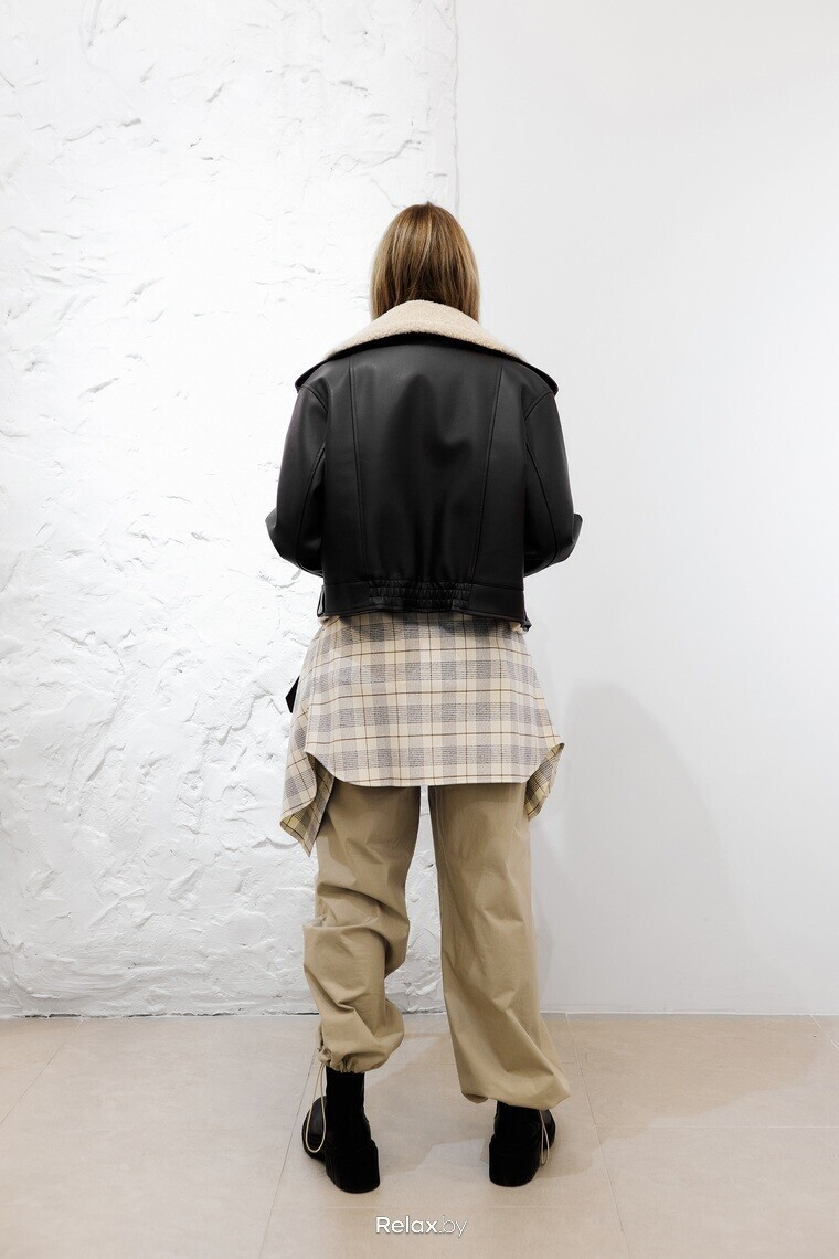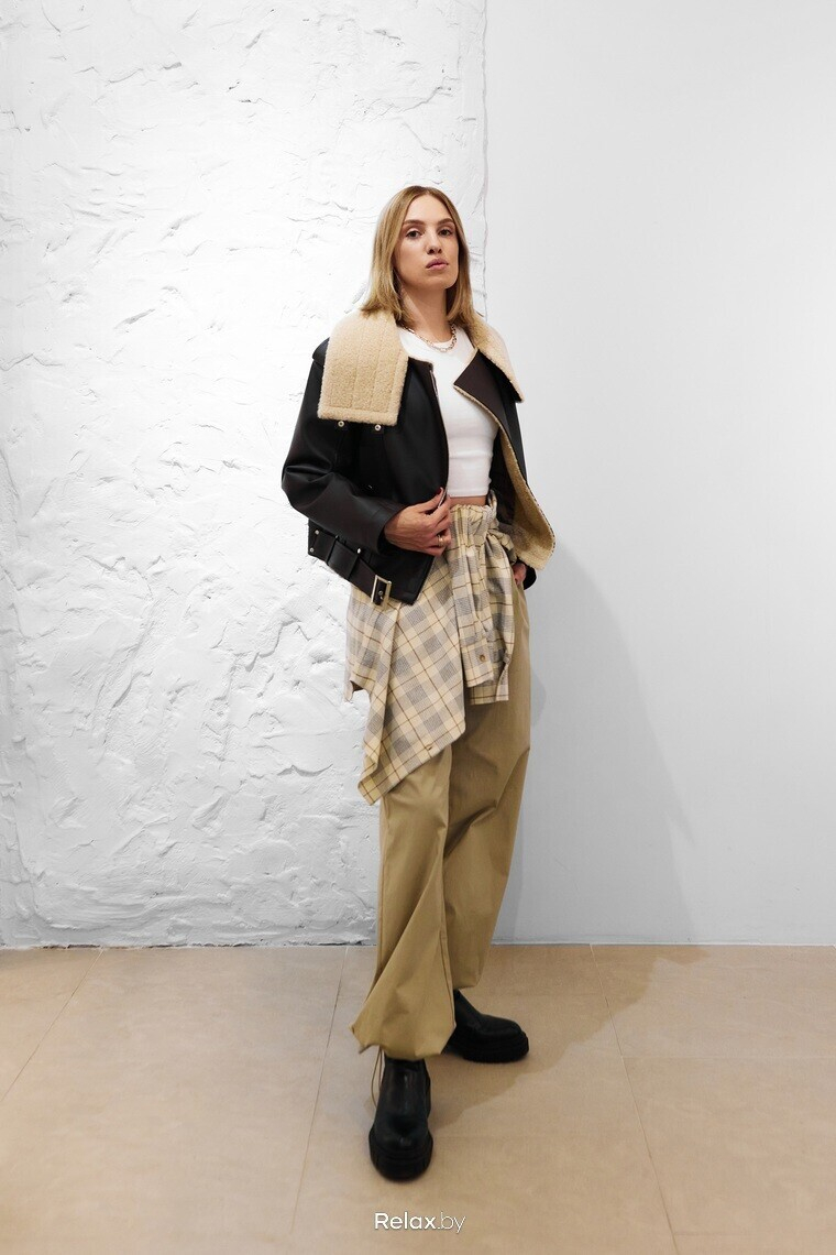 — Этот образ я увела в стиль милитари: грубая обувь, цвета хаки и беж, укороченная дубленка и популярный сегодня прием — повязанная на бедрах рубашка. Бояться здесь нюансов фигуры не стоит, потому что такой вариант подойдет как худеньким девушкам, так и тем, кто не хочет подчеркивать полноту. Важно, чтобы образ был в единой цветовой гамме и не «разрывал» вертикаль. А вот визуально укоротить рост прием с рубашкой может, поэтому рекомендую его все же высоким девушкам.