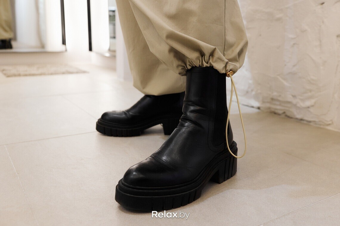 Да, карго сегодня максимально универсальны. Их носят и под шпильку, и под армейские ботинки. Но важно учитывать модель брюк. Вариант с карманами по бокам может «съедать» рост и добавлять объем, поэтому к нему рекомендую отнестись с чуть большей стилистической настороженностью, нежели к модели «парашюты», как выбрали мы.