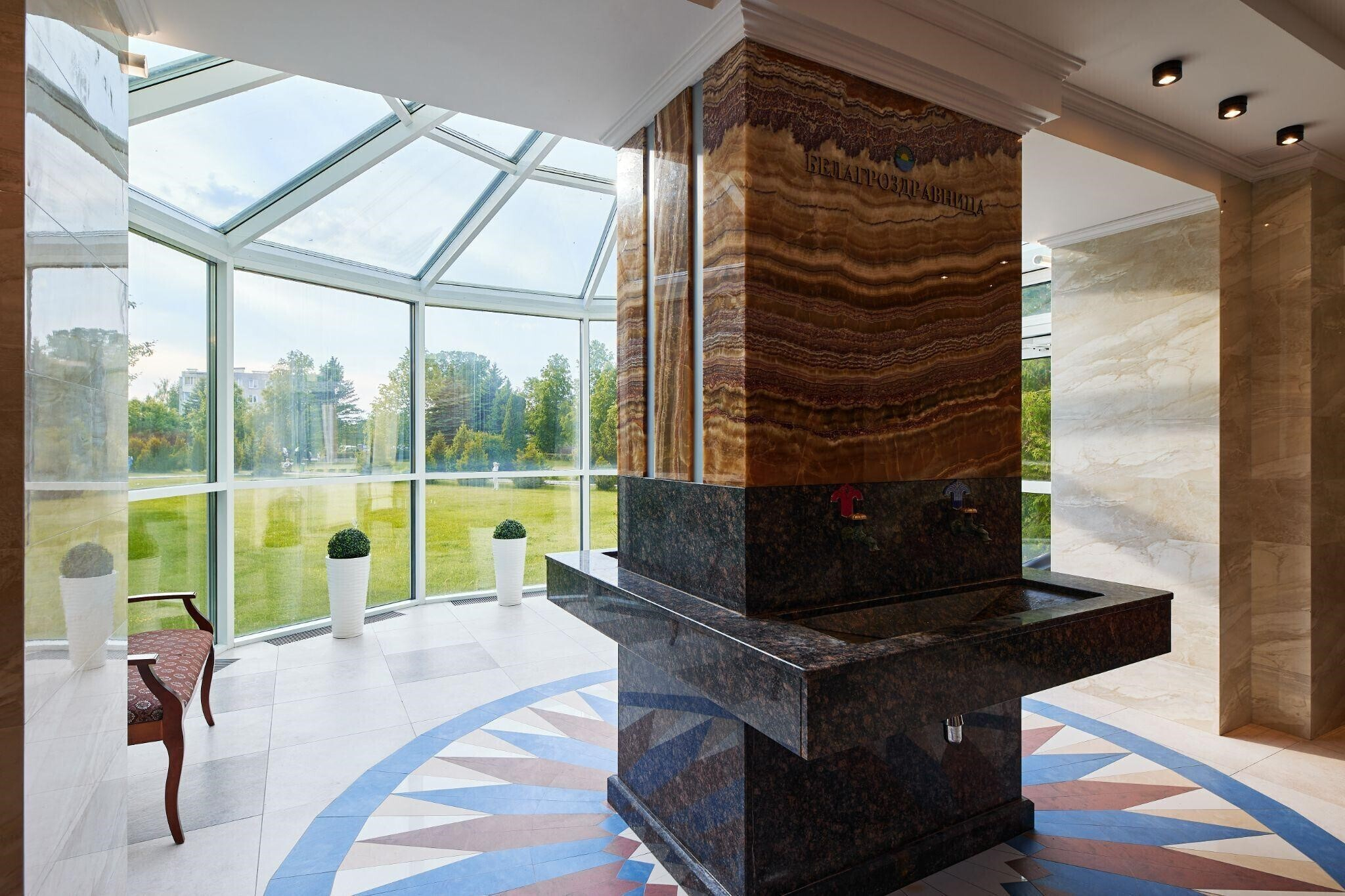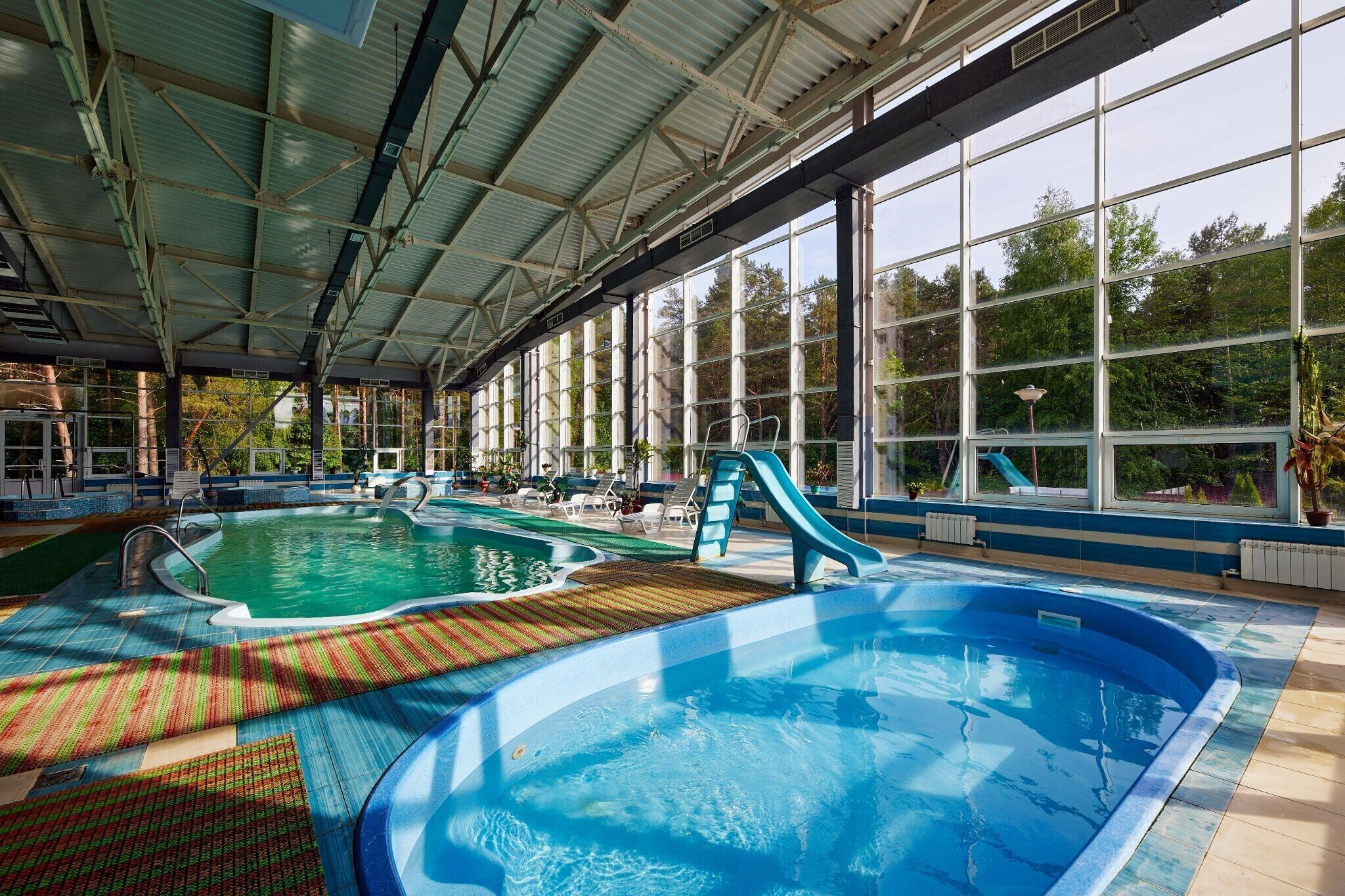 С детьми здесь будет особенно комфортно. Густой лес вокруг создает неповторимый микроклимат, который в том числе наладит ментальное здоровье. Кстати, бювет с минеральной водой оборудован как комната отдыха, где можно сидеть на диване и наблюдать за аквариумными рыбками, не спеша наслаждаясь вкусом воды.