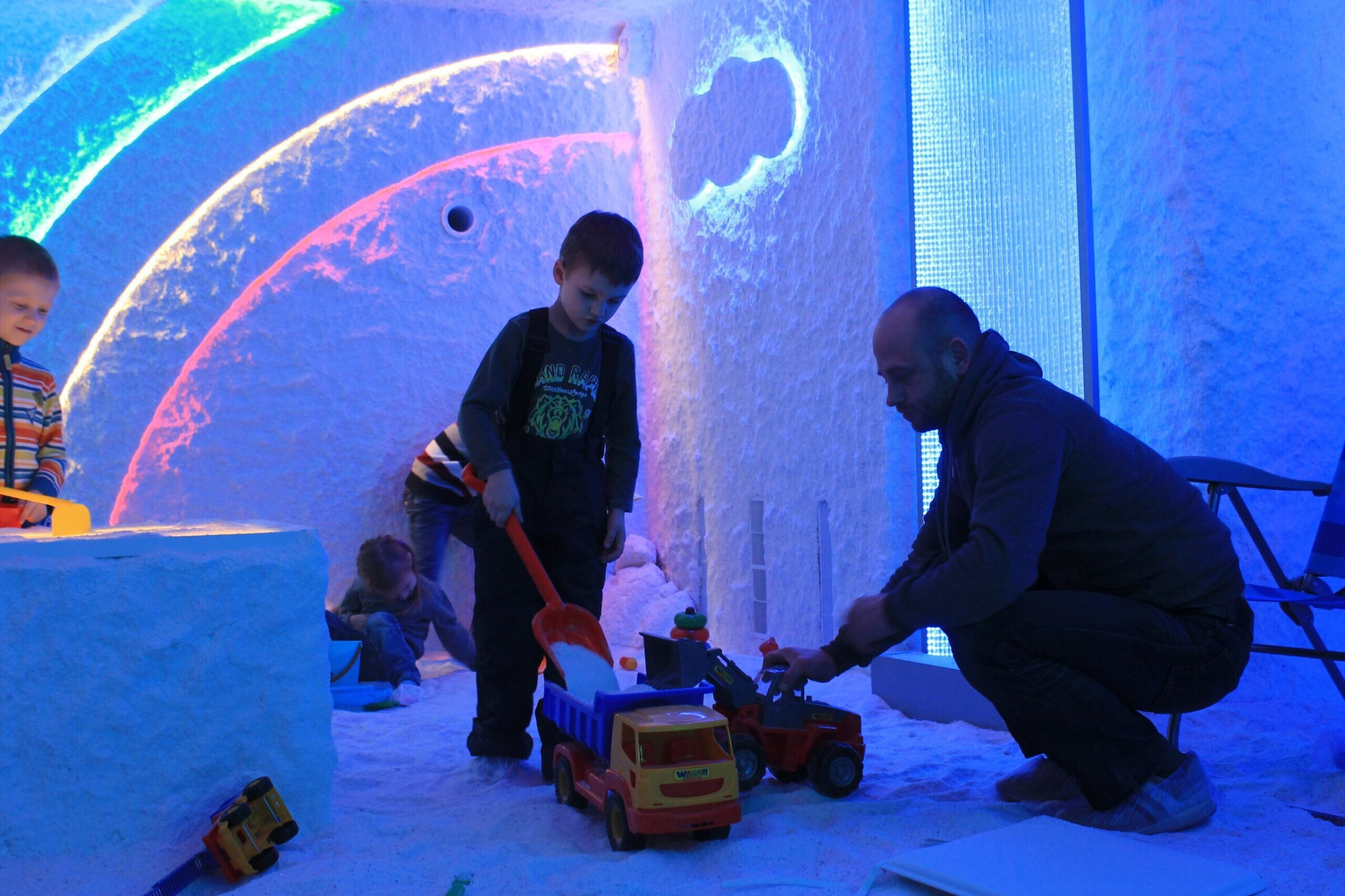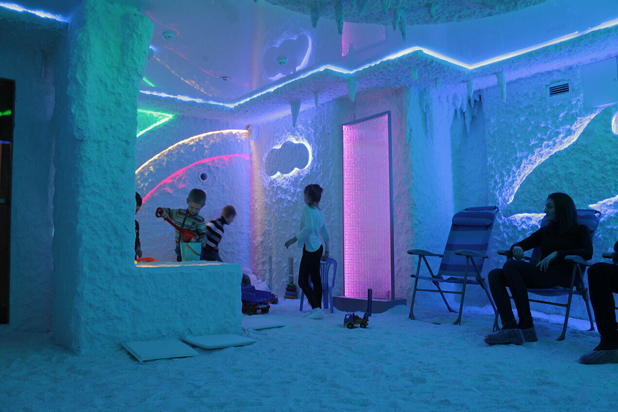 Вы расположитесь в удобном кресле, послушаете расслабляющую музыку, посмотрите видео или просто получите удовольствие от спокойствия и хромотерапии (специальное освещение), которым оборудована соляная пещера. Дети же во время сеанса с удовольствием играют с солью как в песочнице, рисуют на столике для песочной анимации и даже катаются с горки. Пещера успокаивает и нормализует психологическое состояние как взрослых, так и ребенка.
