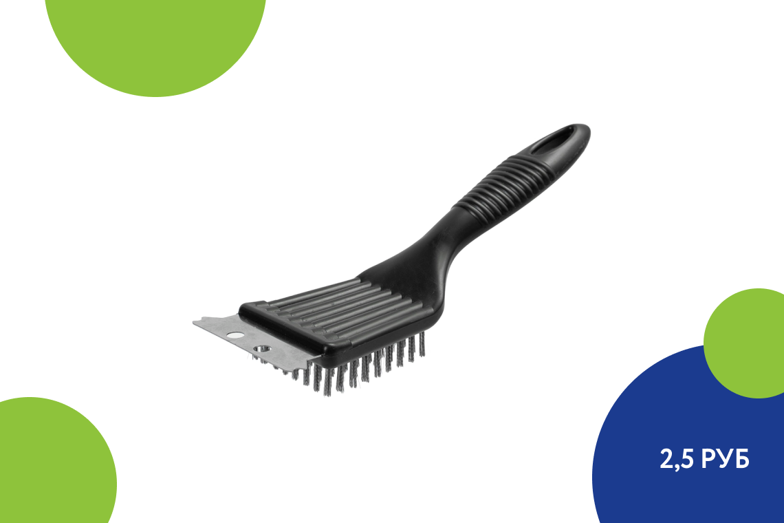 Еще одна деталь, которая оставит приятное послевкусие от пикника, потому что вам не придется тратить 30% бесценного времени на уборки, чистки и так далее. С помощью этой щетки удобнее мыть решетки, шампуры, мангал. Жесткая щетина эффективно удаляет остатки пищи и нагара, а скребок хорошо справляется с более трудными загрязнениями. Помимо полипропилена в составе продукта есть нержавеющая сталь, благодаря чему он прослужит как минимум один сезон.