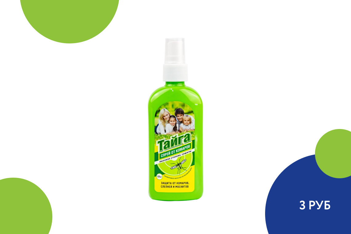 И даже если весной проблема насекомых стоит не так остро, смело забрасывайте спрей в корзину — в ближайшие месяцы он вам точно пригодится! «Тайга» подходит для нанесения на кожу и одежду, что немаловажно, и станет незаменимым помощником не только во время отдыха, но и в период работ на даче. Продукт защищает от москитов, мокрецов, мошек, слепней и кровососущих мух. Перед применением не забудьте внимательно ознакомиться с инструкцией на упаковке!