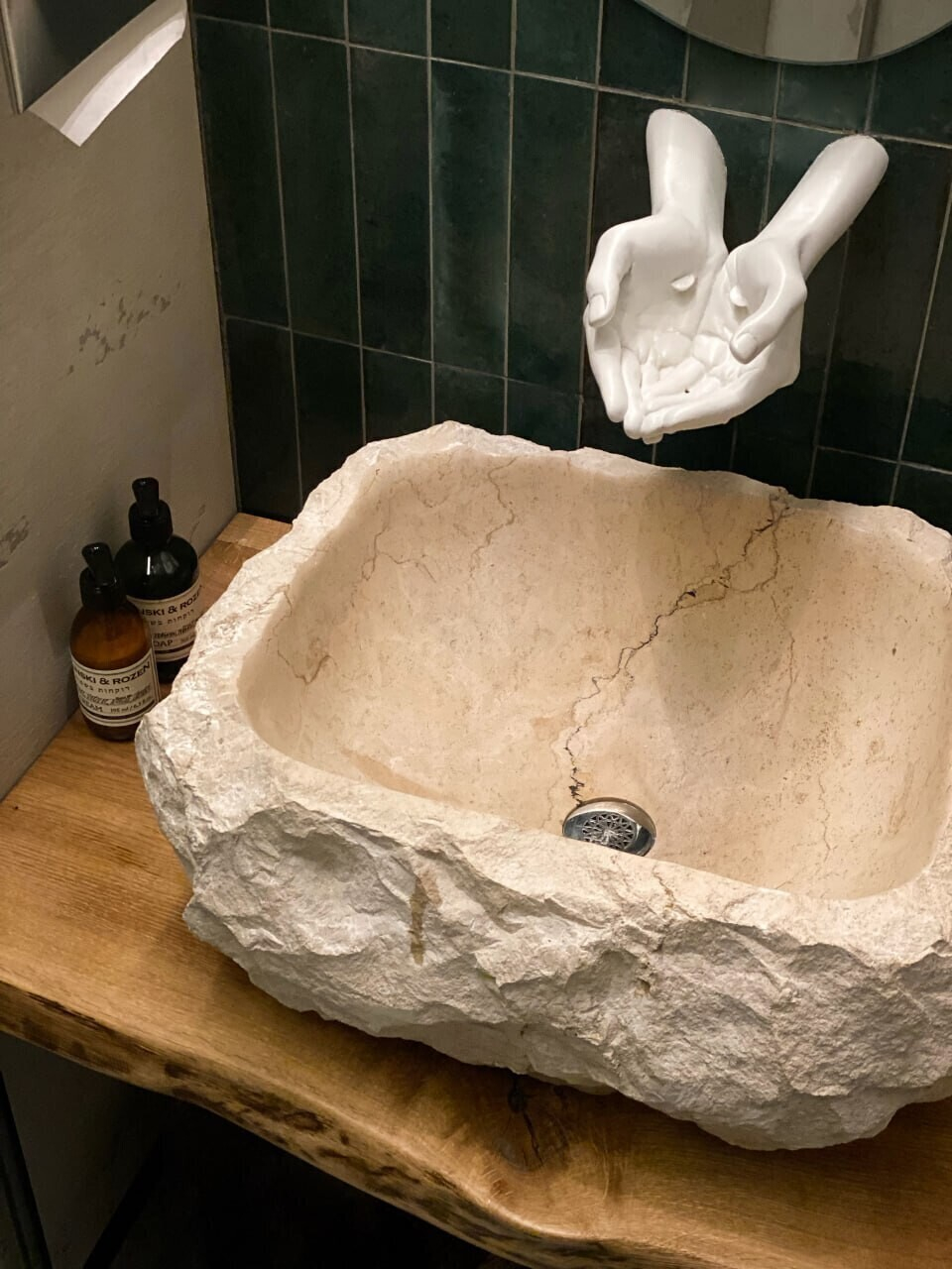 В интерьере — кирпичные стены, хрустальные люстры, лепнина на потолке, плитка на барной стойке. Пространство заполнили оригинальными мелочами, которые можно долго рассматривать. И делать крутые кадры, конечно.