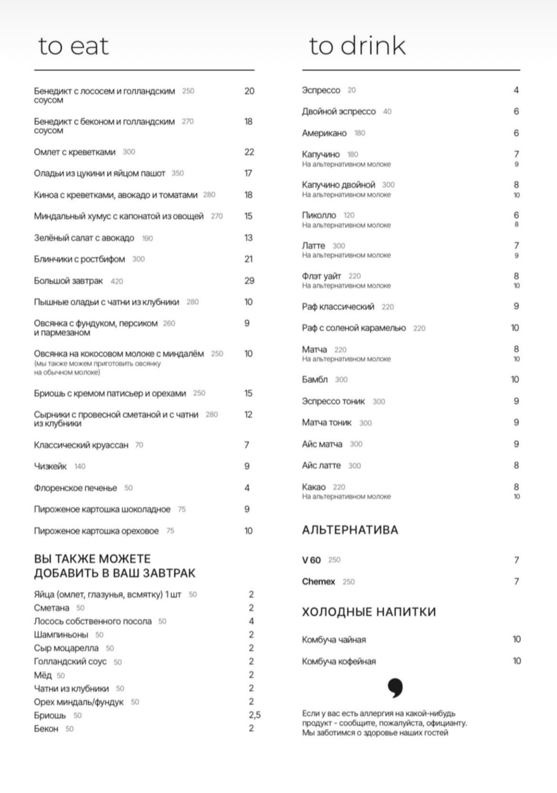 В тестовом режиме место заработало еще 13 мая, сейчас локация набирает популярность. Примечательно, что это не типичная кофейня, которые часто открывают в спальных районах. Здесь большой выбор завтраков (порядка двух десятков позиций), а также салаты, закуски, пасты. Отметим, что завтраки подают весь день. Цены смотрите ниже: на наш взгляд, весьма демократично. Так самая дорогая позиция из завтраков обойдется в 18 рублей.