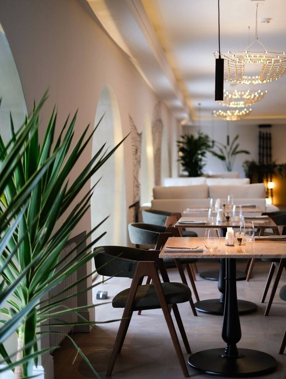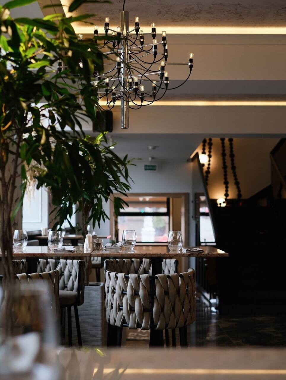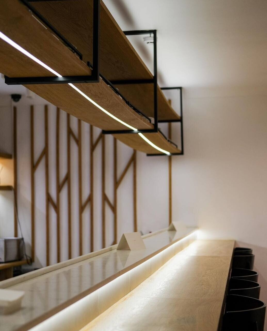 Этот ресторан открылся в далеком 2017 году. Ronin позиционирует себя, как заведение с японской кухней. При этом в интерьере это совсем не отражается: выглядит, как европейская классика. При этом в декоре много натуральных материалов. Так панно за барной стойкой сделаны из натурального мрамора, а один из столов декорирован светящимся ониксом. Необычные светильники специально для ресторана выдували на заводе. А панно, которое встретит вас на входе, сделано из натурального дерева и состоит из более чем 1500 элементов.