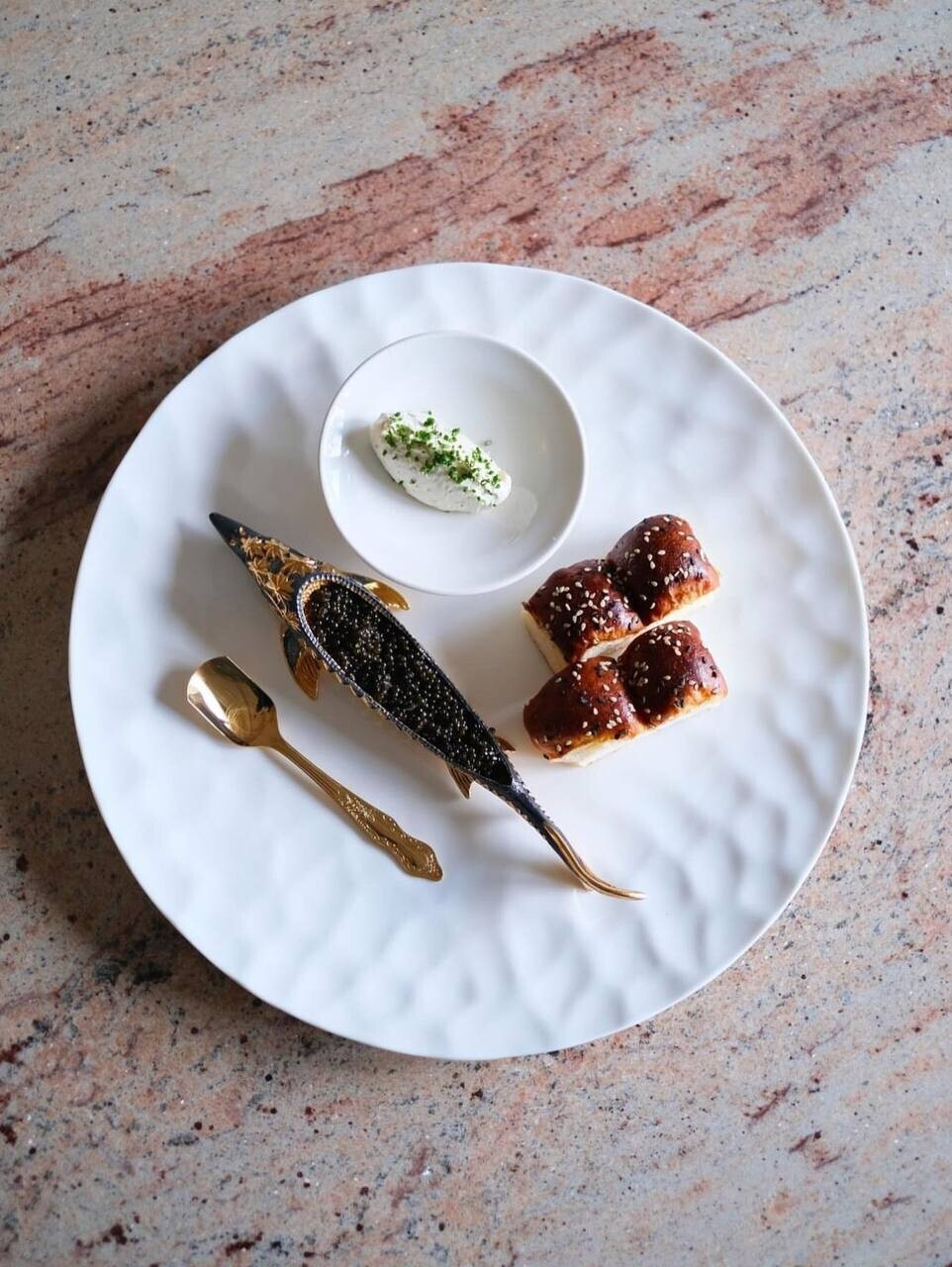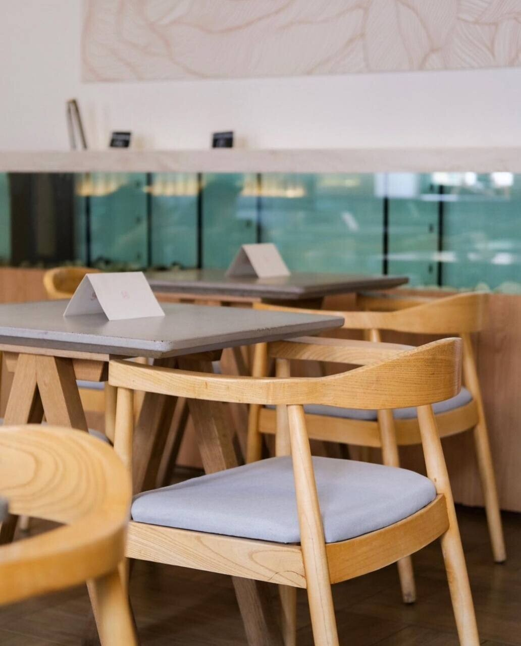 Интерьер получился минималистичным, не отвлекающим от главного — содержимого тарелки. Интересно, что вся мебель, посуда и приборы под заказ привезли из Азии. Привлекает внимание и аквариум с живыми дикими устрицами, гребешками, морскими ежами и крабами. Но имейте в виду, что «живность» в аквариумах есть не всегда.