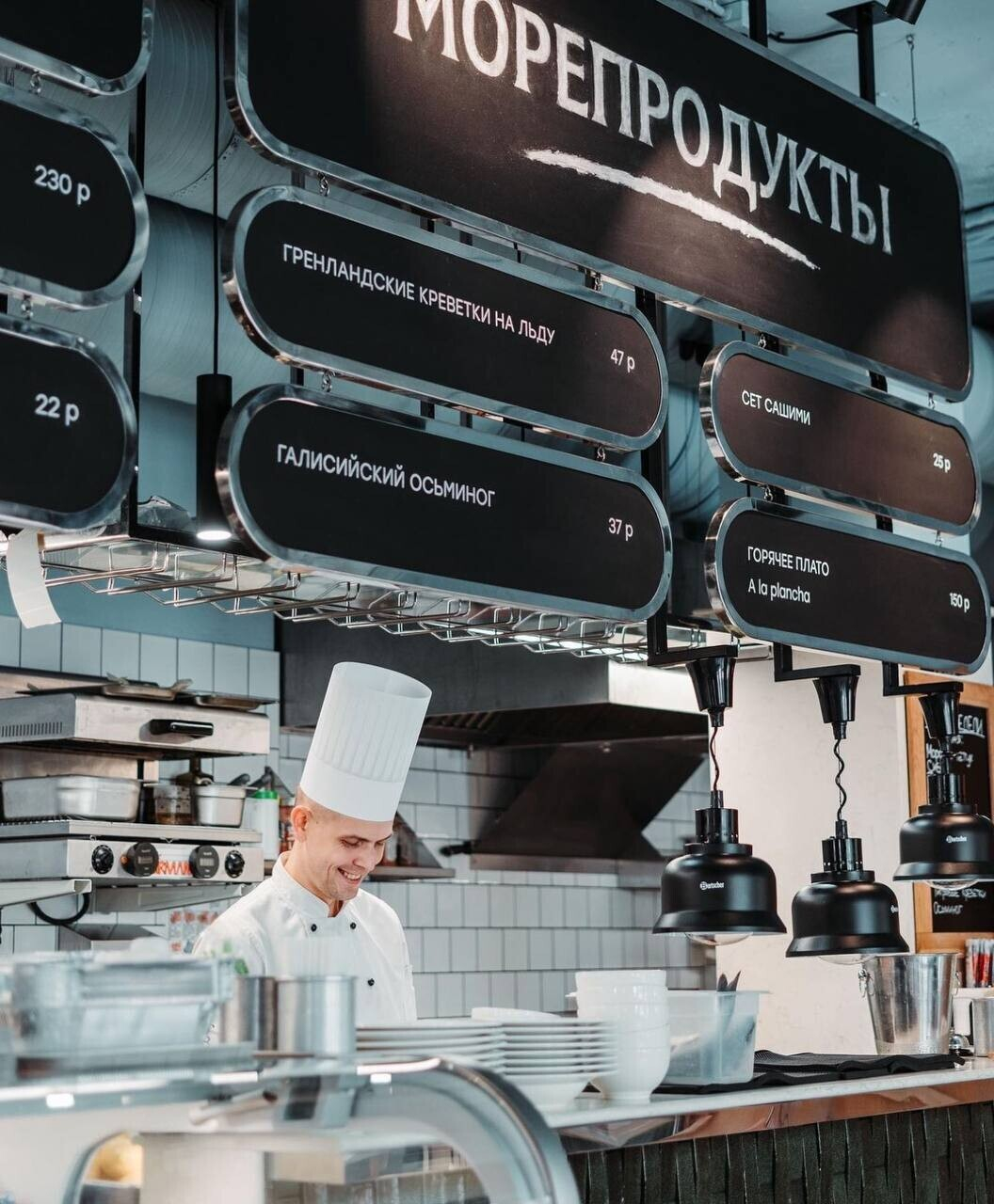 «Атмосфера рыбного рынка, которая подчеркивается натуральными материалами. В интерьере используются прямые цитаты и ассоциации: это и море с пляжем из гальки и морскими водорослями, и безоблачное небо, и трюмы кораблей (железные детали), и ящики с уловом (деревянная обшивка на стенах)».