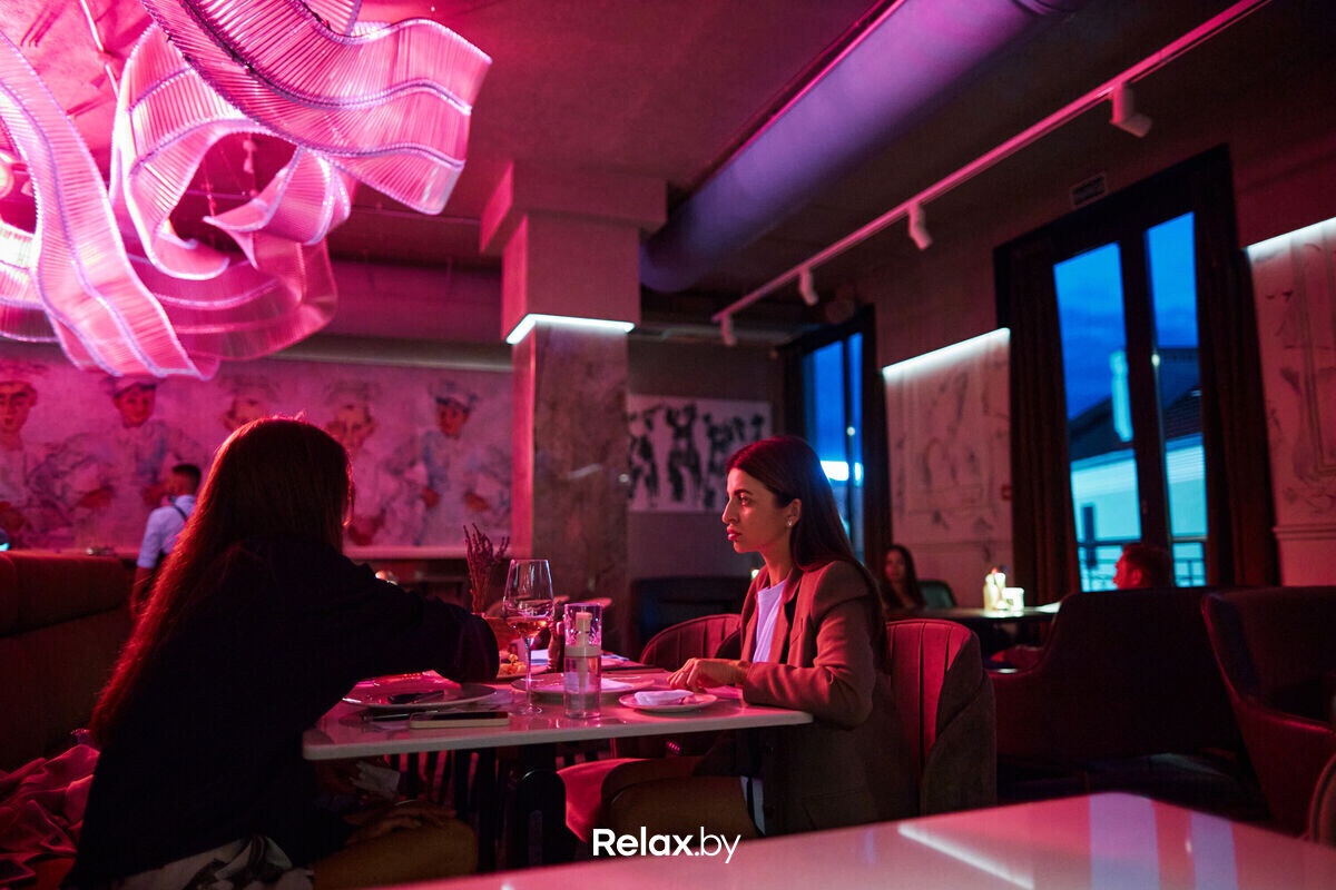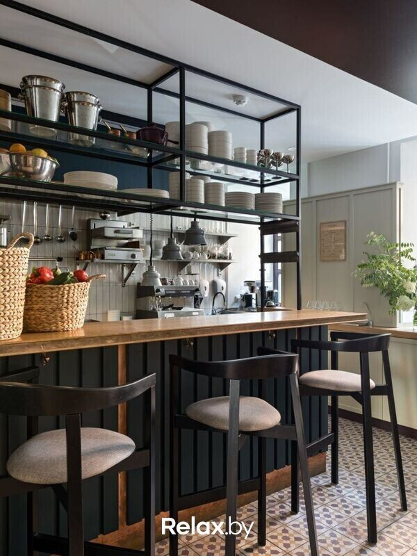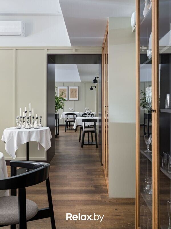 Еще один атмосферный бонус — расположение ресторана в здании 18 века. Это бывшая минская резиденция Пшадецких. Интерьер выполнен с использованием натуральных материалов, спокойных оттенков, мягкого освещения и запоминающихся постеров, которые создают атмосферу уюта с намеком на французскую тематику (любопытно, что французское посольство находится в паре шагов от заведения).