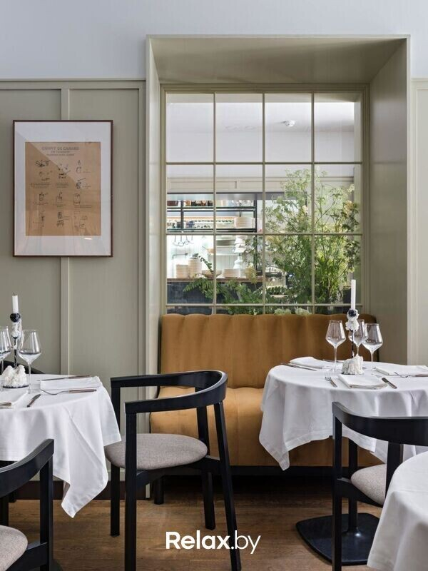 В интерьере — сдержанная классика, спокойные оттенки, золотые детали. Кухня в ресторане европейская и высокая авторская. Обратите внимание и на безупречно подобранную карту вин и других алкогольных напитков.