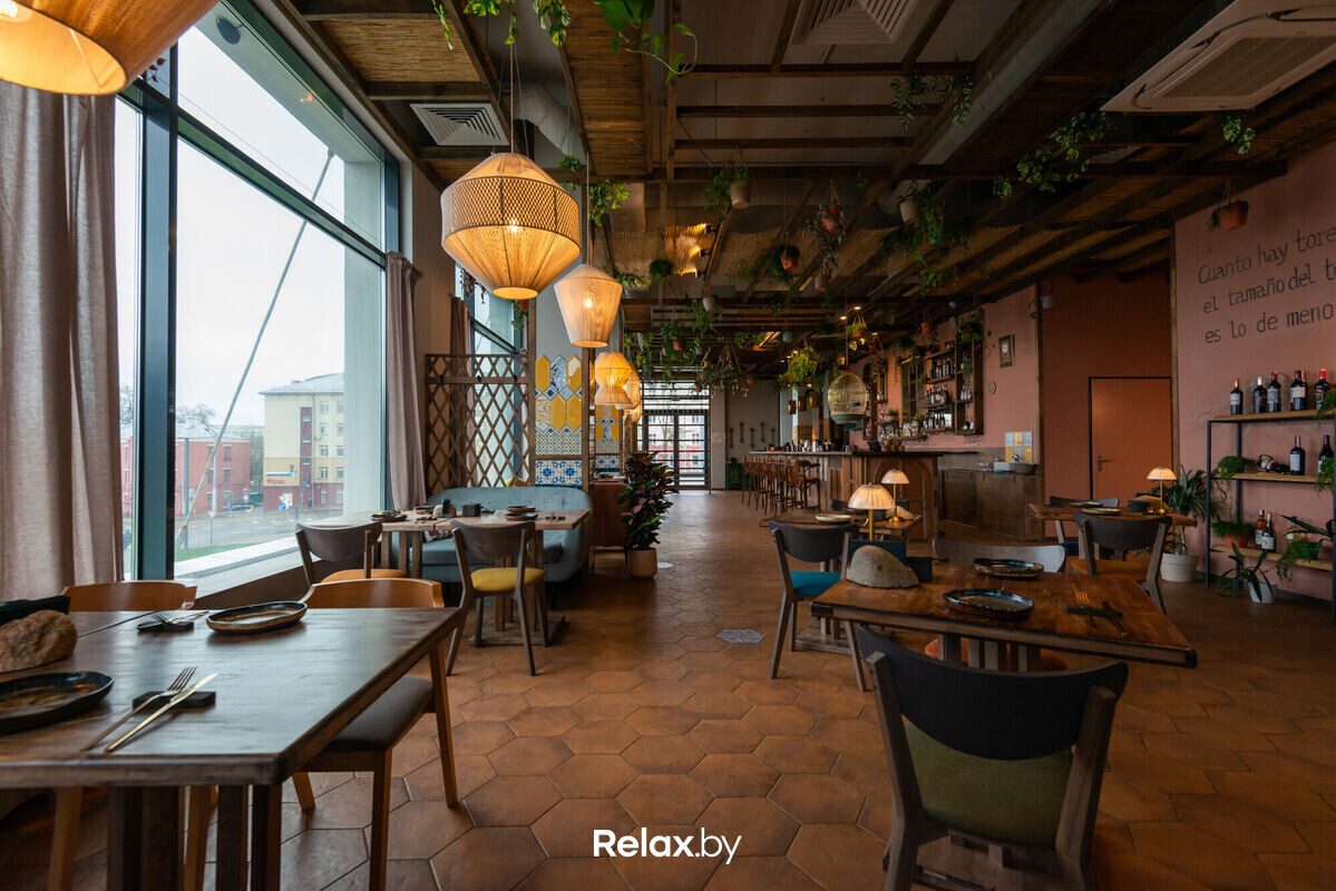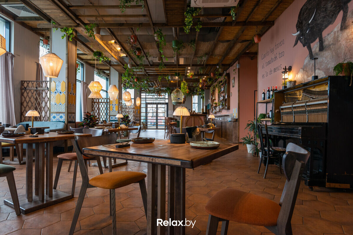 Напомним, что достаточно долгое время на этом месте работал ресторан SEA. По каким-то причинам заведение провело ребрендинг. Итак, что теперь в меню заведения с испанским названием? Можно, например, заказать ассорти тапасов (21 руб.), камамбер из печи (34 руб.), пряный баклажан (10 руб.) или гаспачо из тыквы и вяленых томатов (15 руб.). Также из супов отметим испанский рыбный суп за 20 руб. и фабаду — густой суп с фасолью, овощами и копченостями за 15 руб. Салаты стоят от 18 до 25 рублей, а из горячих позиций отметим криадильях (бычьи яйца) за 17 руб., тартилью с тмином и брынзой за 19 руб. и три вида паэльи — от 25 до 35 руб.
