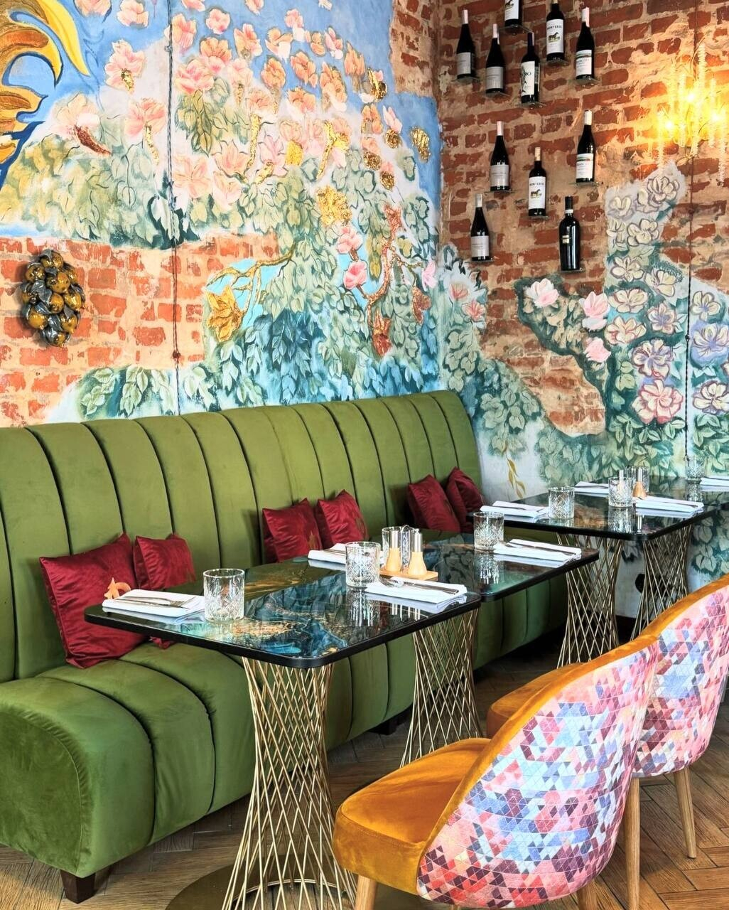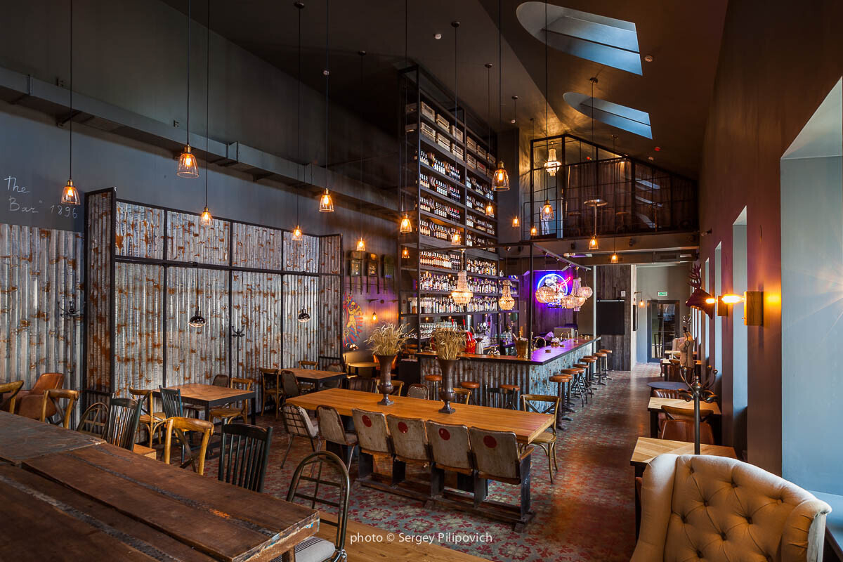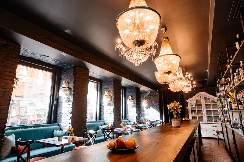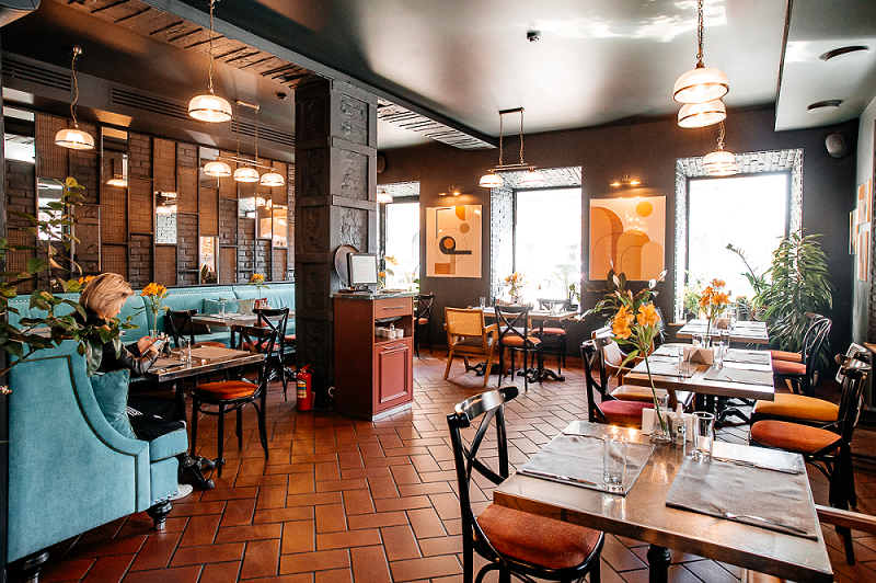 В интерьере комбинация бирюзового, теплых оттенков кирпичного, горчичного, кораллового и темно-зеленого. В одном из залов установлена контактная барная стойка длиной 7 метров. Еще один штрих интерьера — большое количество зелени.