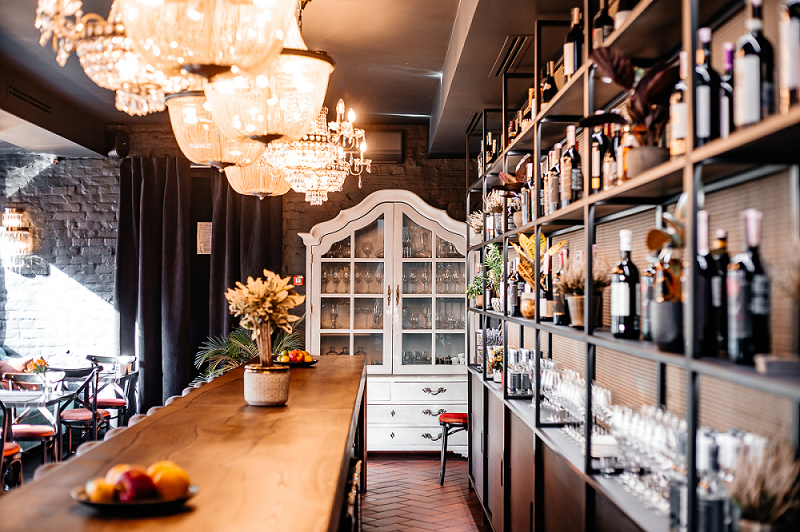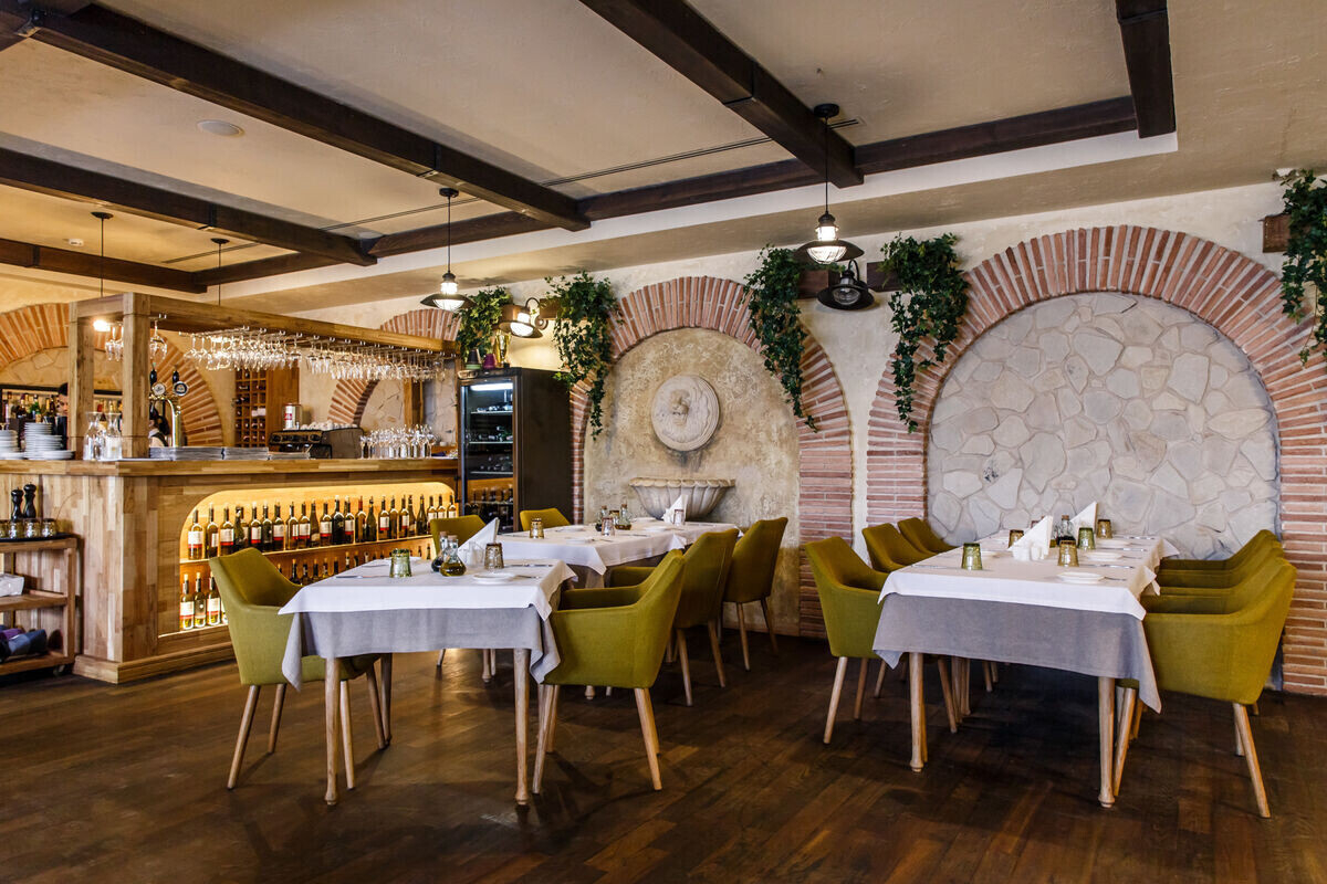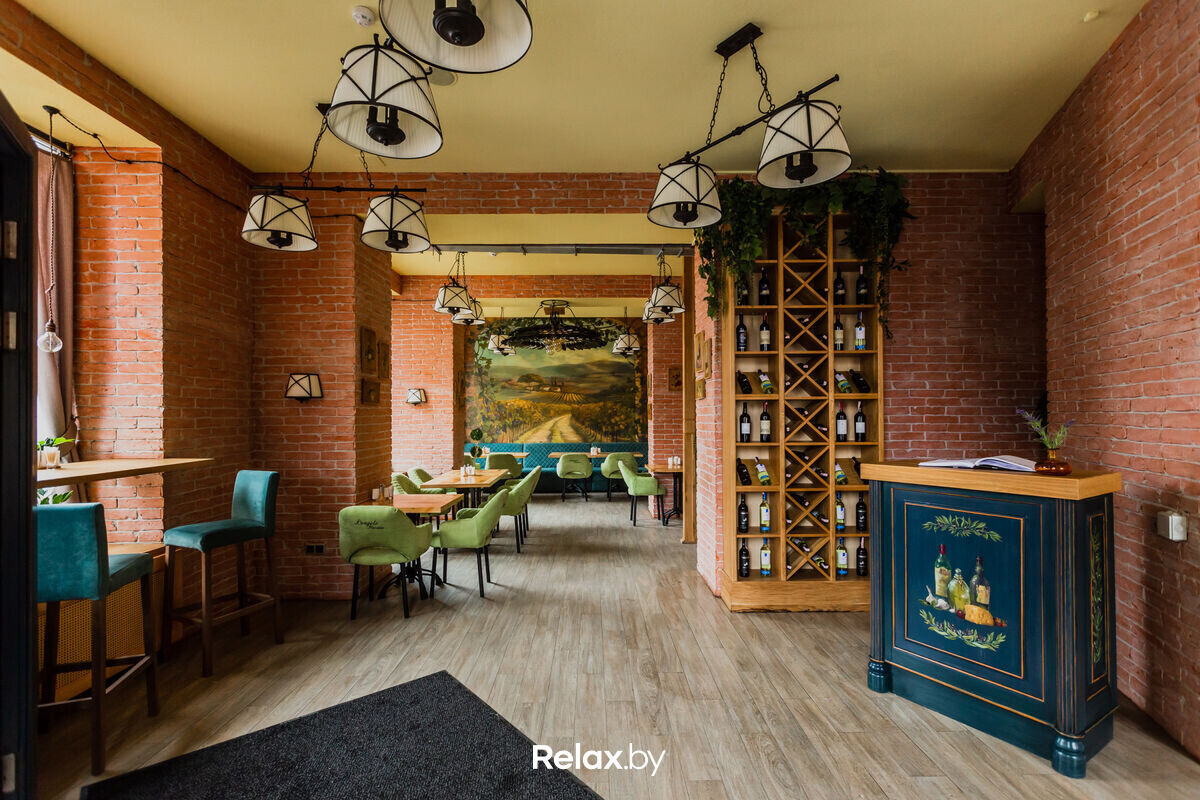 Интерьер напоминает аутентичную итальянскую террасу с небольшими деревянными столиками и уютными сидениями, кирпичными стенами и виноградной лозой. А на самой большой стене — фреска с пейзажем долины в Тоскане. Главным и центральным элементом декора является люстра ручной работы, которую создали из винных бутылок.