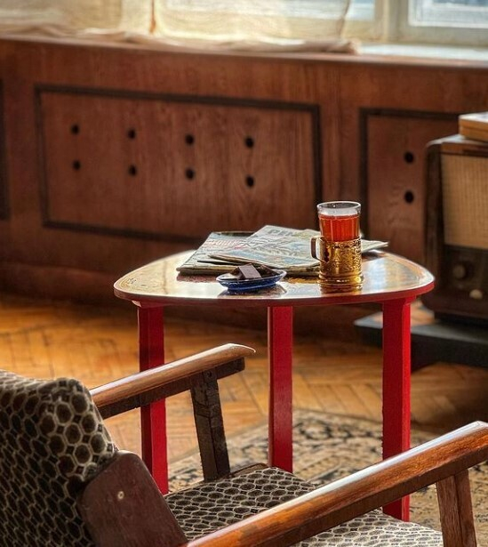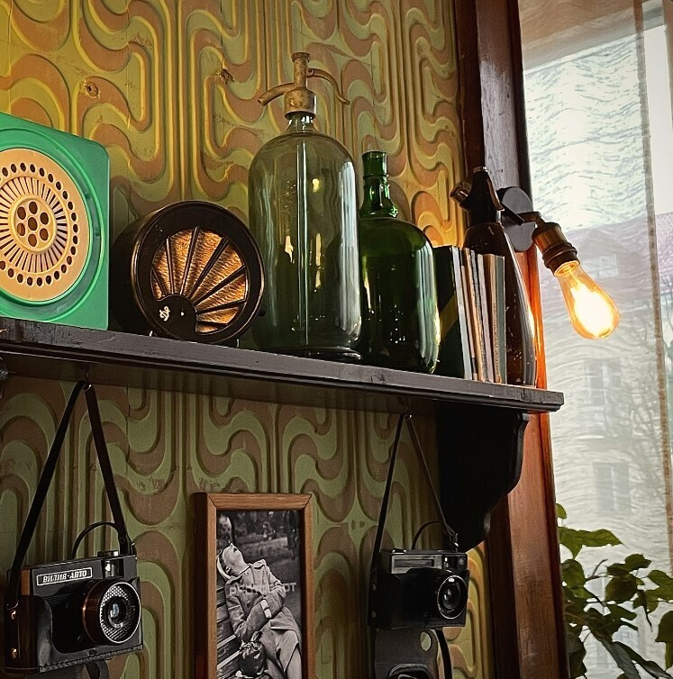 Итак, вы нахватали целый пакет винтажной красоты. Не спускайтесь вниз по лестнице — идите прямо, там вас ждет еще один сюрприз, переносящий во времени. Кафе–ностальгия, где пиво по-прежнему в трехлитровых банках, а по старому телевизору показывают любимые советские комедии. Меню под стать: пельмешки, беляши, чебуреки, шпроты… В общем, генетическая память в такие моменты просыпается.