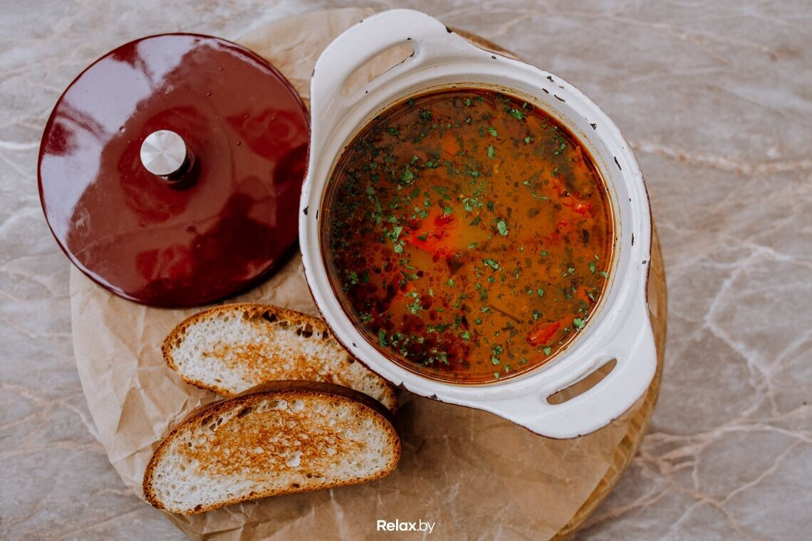 Итак, выносят первое блюдо — это шурпа. Это наваристый восточный суп заправленный крупно нарезанными овощами, с нежными кусочками вареного мяса, приправленный ароматными специями. Умеренная остринка и ярко выраженный аромат. Ирина отмечает, что найти эту позицию в заведениях Минска не так уж и просто — готовят суп достаточно редко. Уточняем, используют ли на кухне бара сезонный продукт.