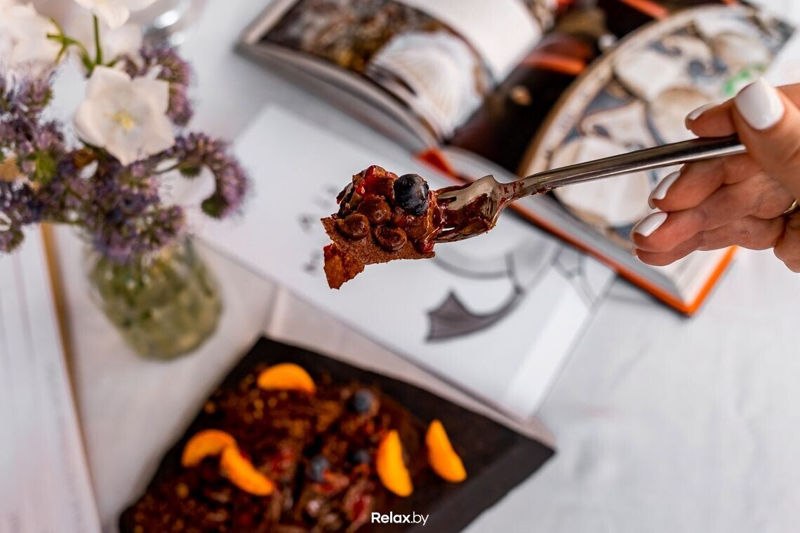 Мы адаптировали классический рецепт под нашу авторскую концепцию. Для его приготовления используем шоколадные чипсы из теста tuile (тюиль), которое прослаивается кремом ганаш из темного бельгийского шоколада и малинового кули.