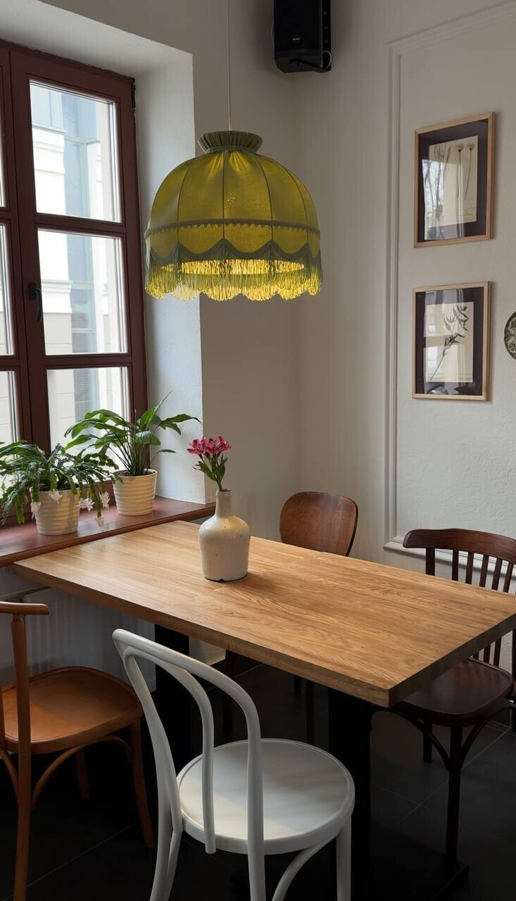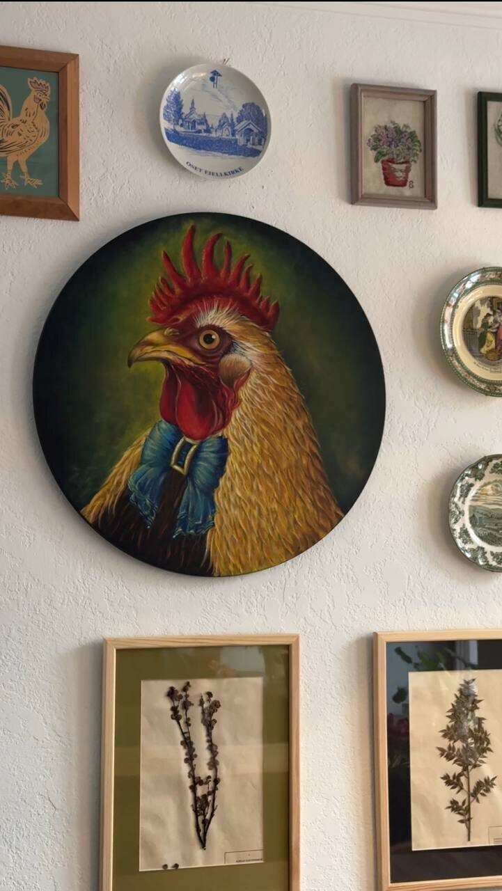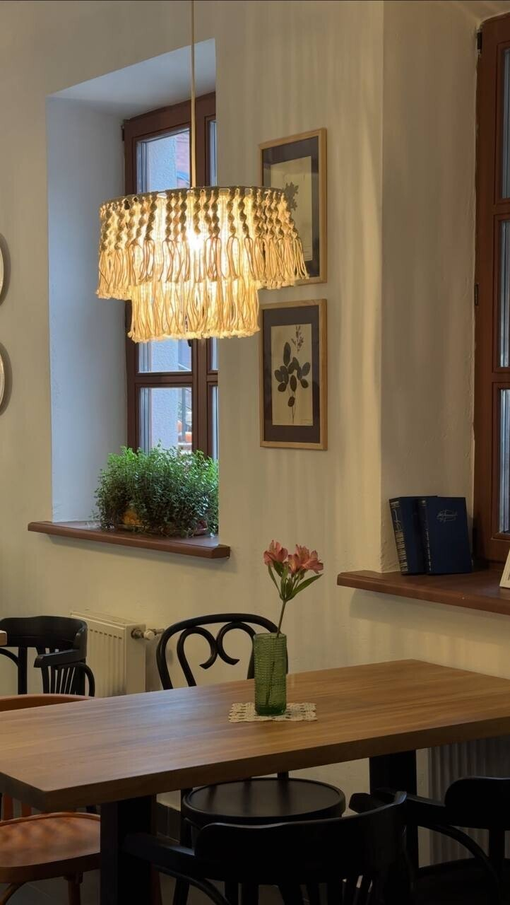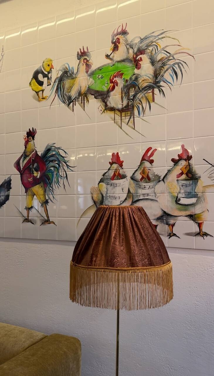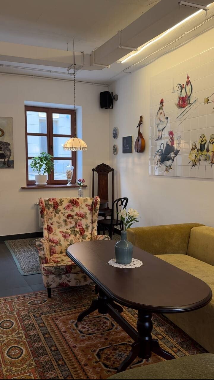 Старый комод, микс из стульев разных стилей и эпох, светильники, обтянутые тканью, ковры, цветы, винтажная посуда и огромное количество тщательно подобраных картин. К слову, много работ белорусских художников. Скоро возле них появится QR-код — можно будет приобрести. Удобно, что на втором этаже есть стол на большую компанию, а летом можно будет разместиться на балкончиках. В социальных сетях заведение описывает себя так: «Про людей, самых — самых разных, про самую вкусную курочку на гриле, про уютные посиделки с бокалом вина».