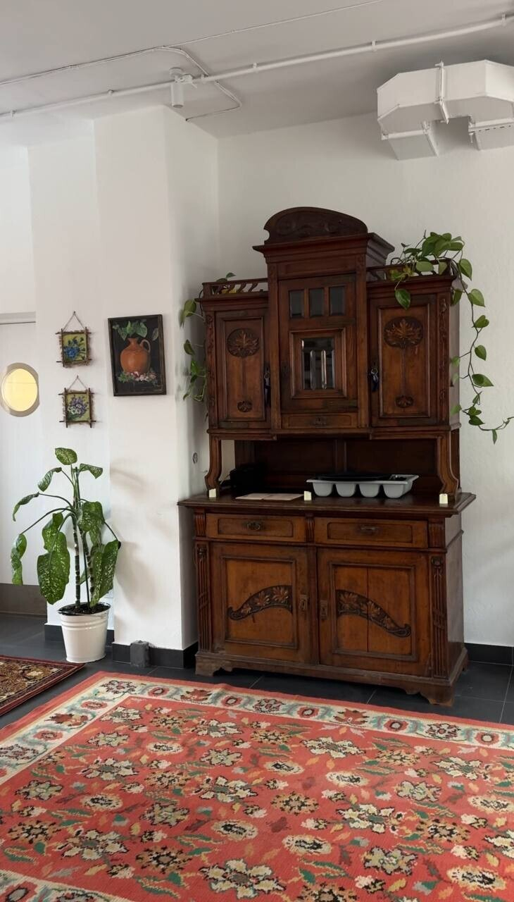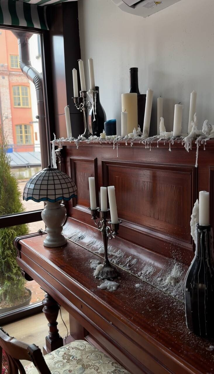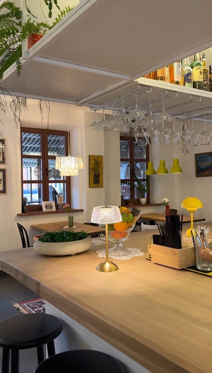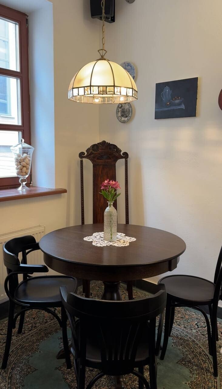 Старый комод, микс из стульев разных стилей и эпох, светильники, обтянутые тканью, ковры, цветы, винтажная посуда и огромное количество тщательно подобраных картин. К слову, много работ белорусских художников. Скоро возле них появится QR-код — можно будет приобрести. Удобно, что на втором этаже есть стол на большую компанию, а летом можно будет разместиться на балкончиках. В социальных сетях заведение описывает себя так: «Про людей, самых — самых разных, про самую вкусную курочку на гриле, про уютные посиделки с бокалом вина».
