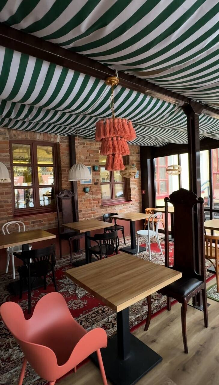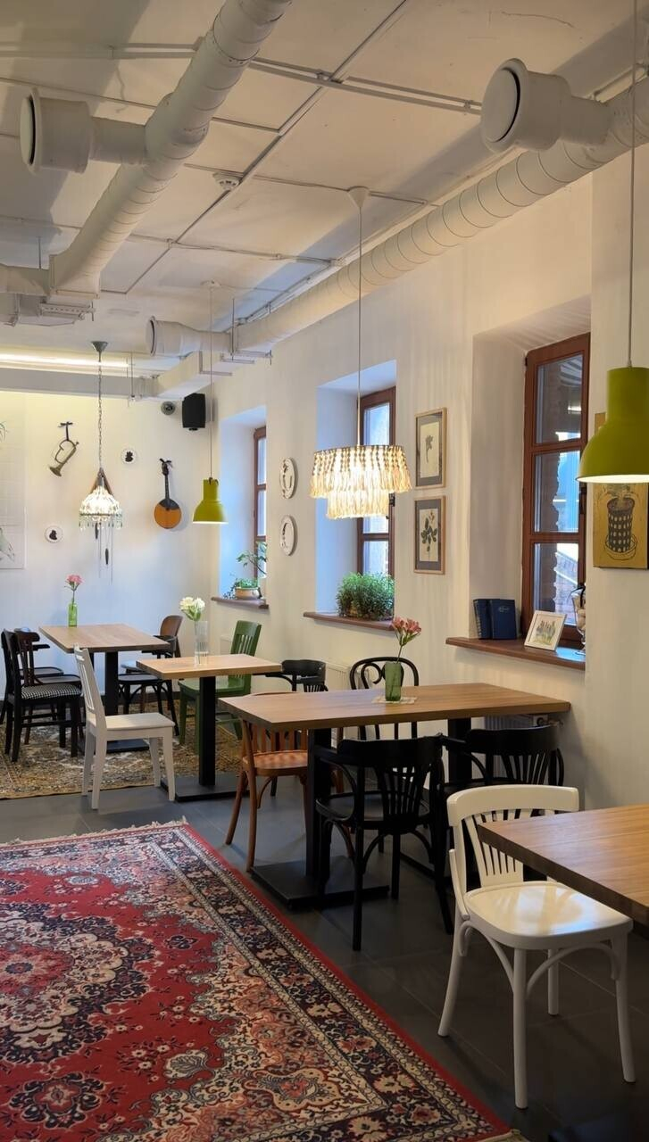 Интерьер заведения нам очень импонирует. Во-первых, решает архитектура: два этажа, много пространства, много окон, а значит и естественного света. Интерьер получился предельно уютным: хочется сидеть здесь вечерами при теплом свете торшера. Дизайнеры соединили современные элементы и винтаж, причем очень гармонично. Как будто оказываетесь в квартире у любимой бабушки.