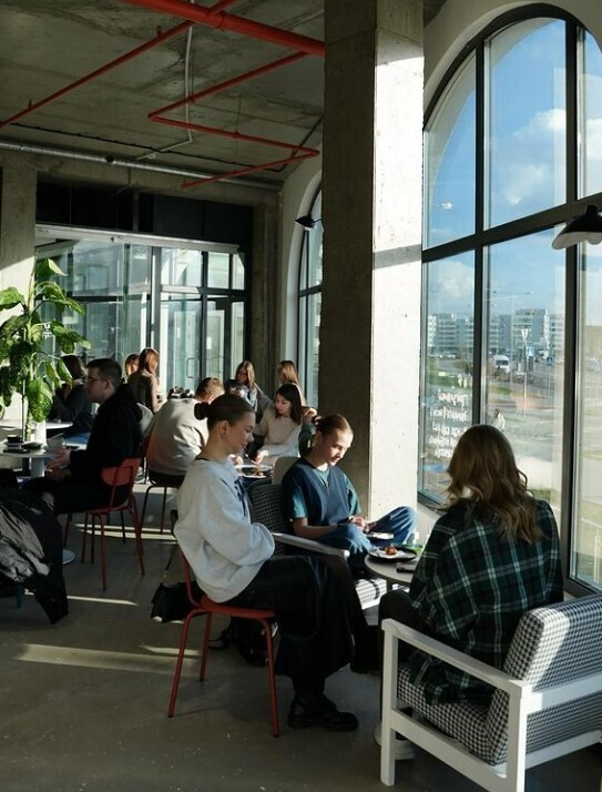 Зведение описывает себя, как vegan, pet и freelance friendly. Об этом гласит и надпись на входе: «К нам можно с ноутбуком – сидите сколько хотите, но только, пожалуйста, за большим синим столом». Впрочем, в заведении это не единственная надпись: смешные фразы вы найдете и в зале заведения. Пространство кофейни получилось минималистичным, светлым, просторным. По стилистике похожа на гродненскую. Бесспорный плюс и в панорамных окнах: в заведении много света.