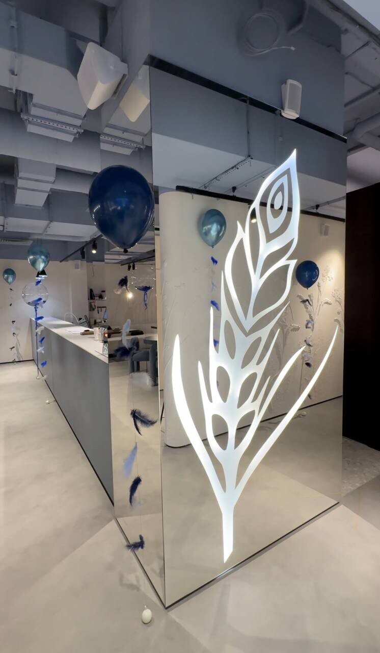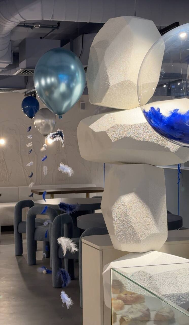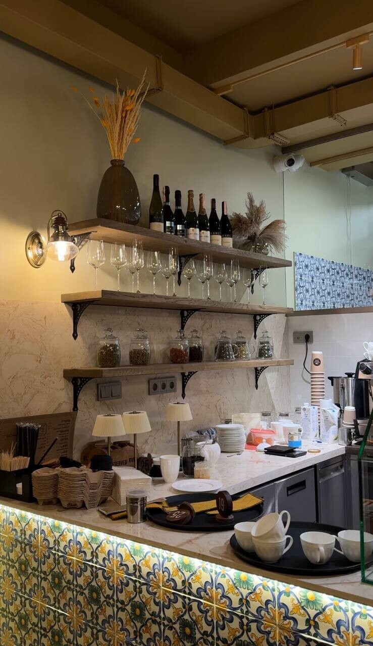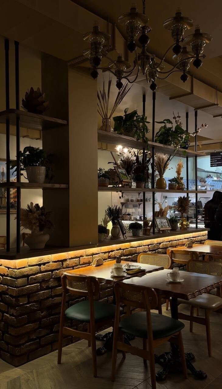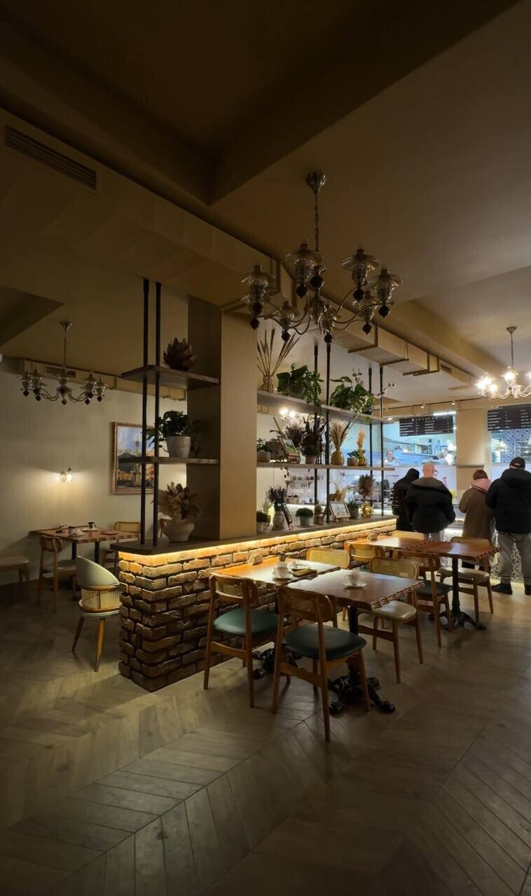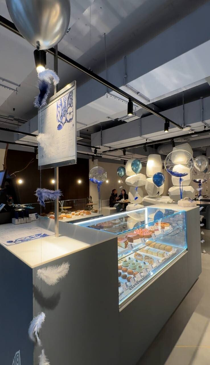 Зал просторный, светлый благодаря грамотному освещению, потому что дневного света в пекарню поступает немного. Приятное глазу сочетание светлого бежа и кобальтового синего, много зеркал. И уже ставшая хорошим тоном открытая кухня, позволяющая наблюдать за процессом приготовления.