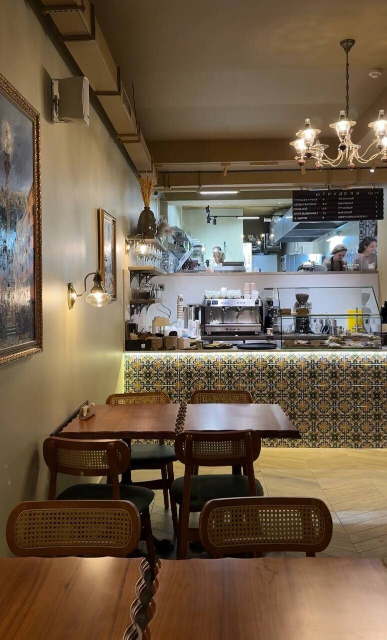 В интерьере ставку сделали на уют и камерность. Приглушенный желтый свет, ореховое дерево, зеленая обивка на классических стульях и удобное зонирование зала — есть столы как для двоих, так и на небольшие компании. В общем, выглядит, как классическая штрудельная, придерживающаяся традиций.